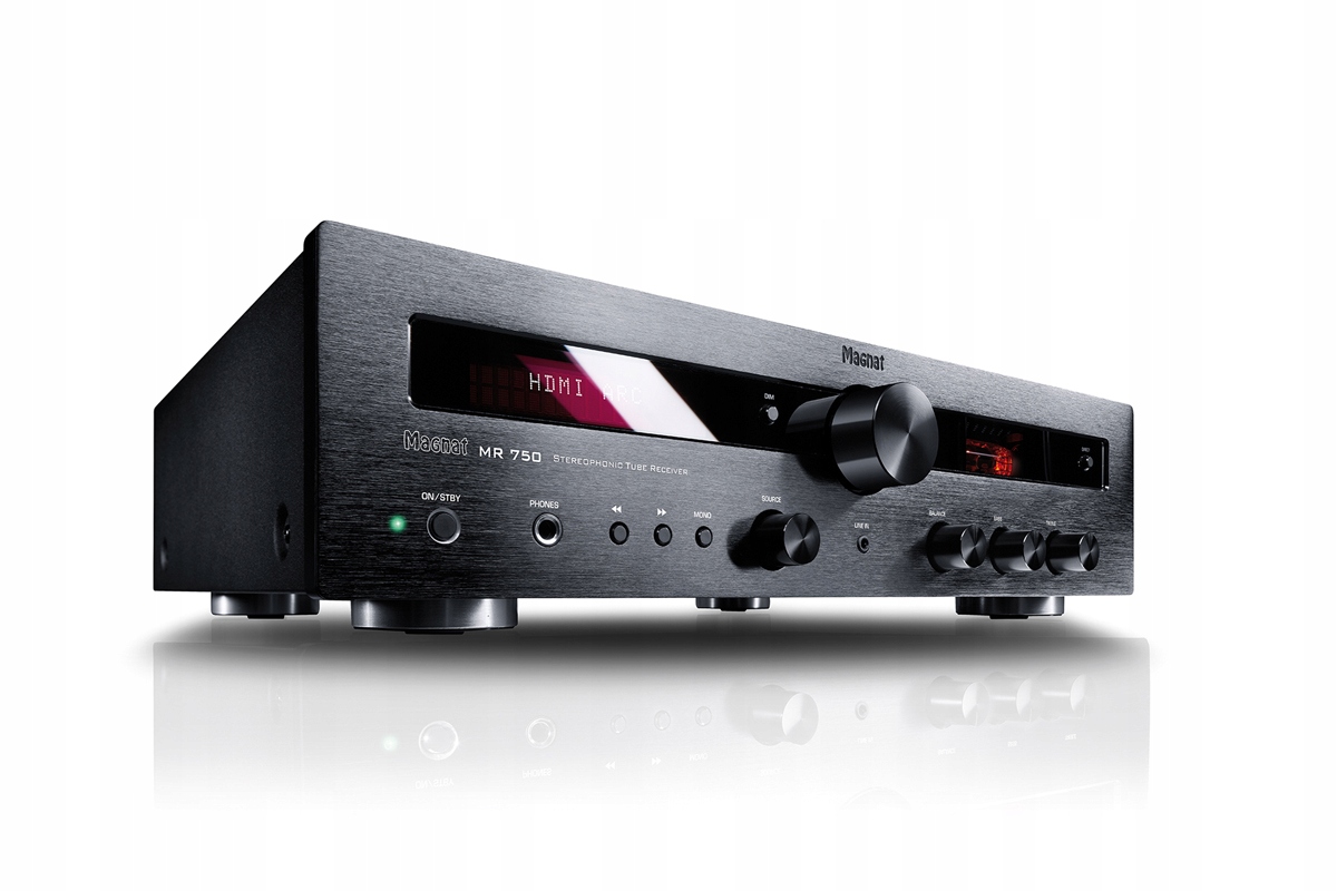 Гибридный стереоресивер Magnat MR 750. Его выходная мощность составляет 2 x 70 Вт, 4 Ом. Большое количество аналоговых и цифровых входов. Особого внимания заслуживает разъем HDMI (с функцией ARC и CEC) и встроенный предусилитель для картриджей ММ.