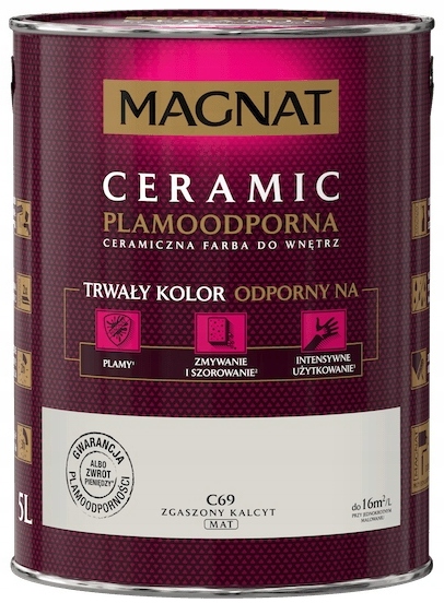 magnat ceramic -это высококачественная, инновационная, керамическая и устойчивая к керамическая и окращая внутренняя краска. Он основан на керамических компонентах и высочайших качественных смолах и пигментах. Эта уникальная формула обеспечивает краску, устойчивую к: пятнам, промывке и очистке и интенсивному использованию.