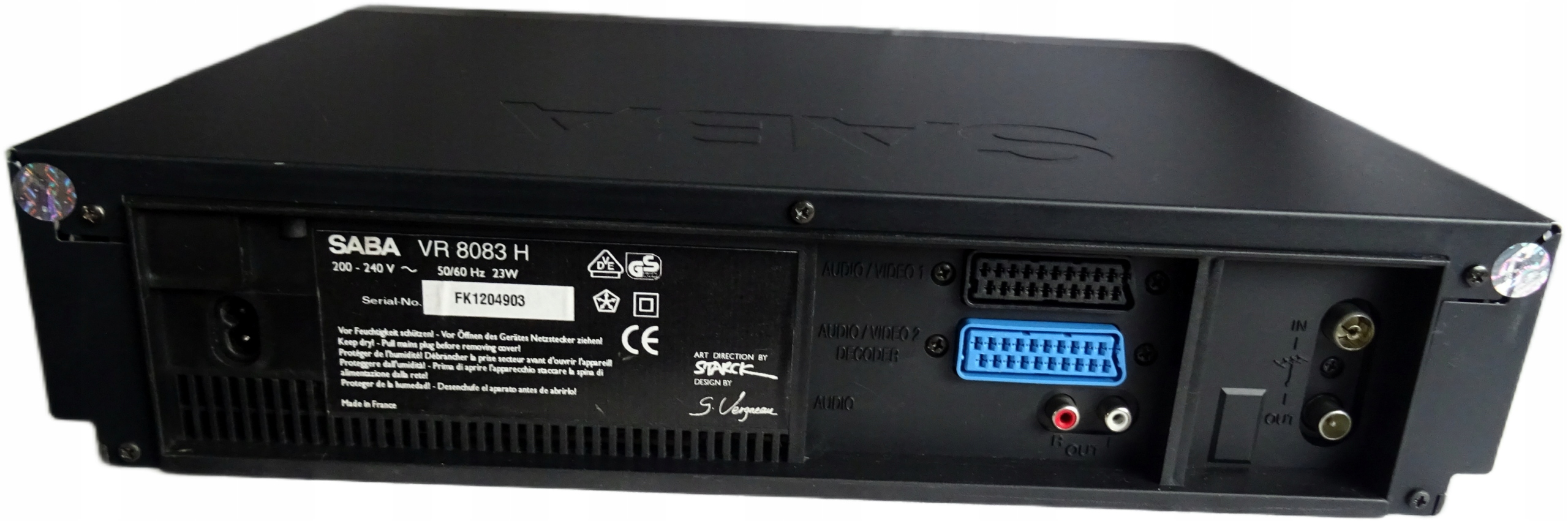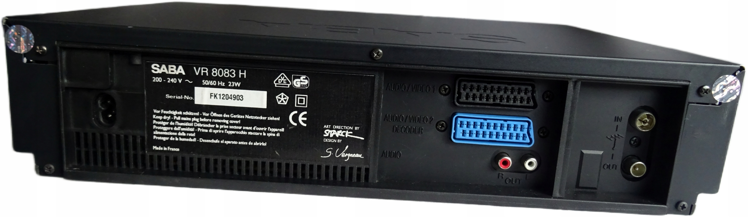Предмет продажи – высококлассный видеомагнитофон SABA модели VR 8083 H. Это устройство уникально не только по своим техническим параметрам (максимальная комплектация с 6 головками), но прежде всего по дизайну. За художественное руководство проекта отвечал знаменитый Филипп Старк, что подтверждает подпись на корпусе. Это оборудование, которое сочетает в себе великолепное качество изображения и звука с неподвластным времени стилем.