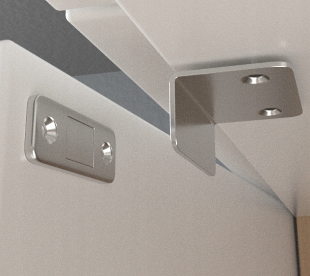 Практическая и сдержанная магнитная защелка, идеально подходит для шкафов, дверей, ящиков, ванной и кухонной мебели. Набор состоит из металлической пластины с магнитом и углом