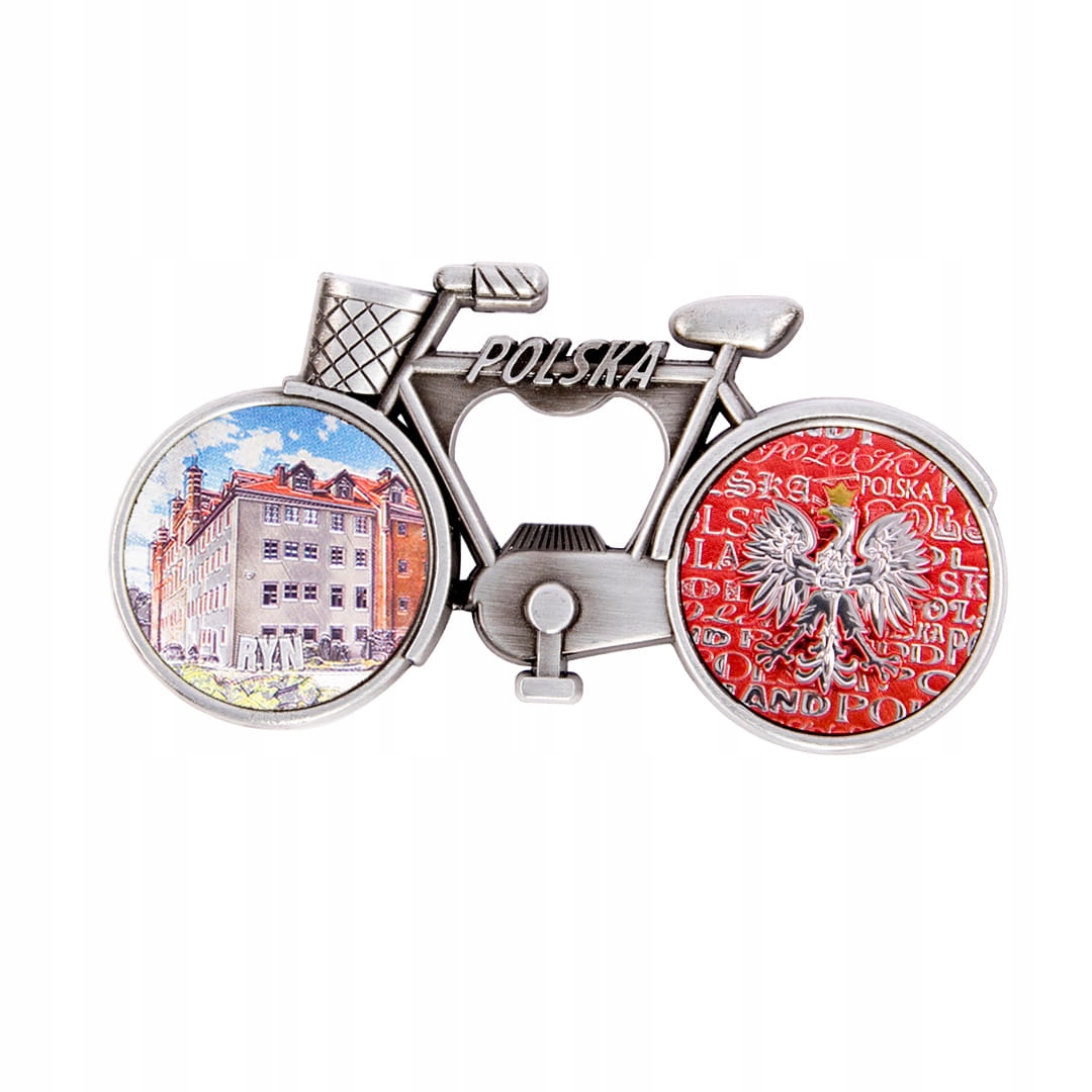 Металлический элегантный магнит, служащий одновременно открывалкой, в форме велосипеда с корзиной, рама которого украшена надписью Польша. Колеса велосипеда наполнены яркими фактурными наклейками с рельефной, приятной на ощупь поверхностью, переливающейся на свету металлическим блеском. На заднем колесе изображен орел в короне на бело-красном фоне из слов «Польша». На переднем колесе изображен вид на замок и четкая, выпуклая, блестящая, никелированная надпись Ryn. На оборотной стороне сувенира расположены два небольших, но сильных неодимовых магнита, обеспечивающих постоянное и надежное крепление изделия к металлической поверхности.