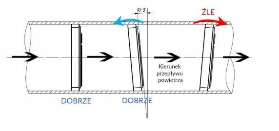 Класку должен быть полностью вставлен в вертикальном положении, в прямой и горизонтальный сегмент вентиляционного протока диаметром 150 мм, сохраняя выровненную ось механизма и таким образом, что обеспечивает его свободное движение. Разрешено отклонением от вертикальной позиции до 5? В соответствии с рисунком.