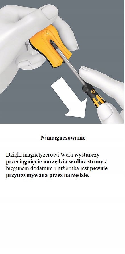 Электростатически безопасный инструмент благодаря поверхностному сопротивлению ≤ 109 Ом. Просто проведите инструментом по положительной стороне, и он надежно удержит винт на валу. Чтобы размагнитить инструмент, проведите его вдоль отрицательной стороны намагничивателя Wera.