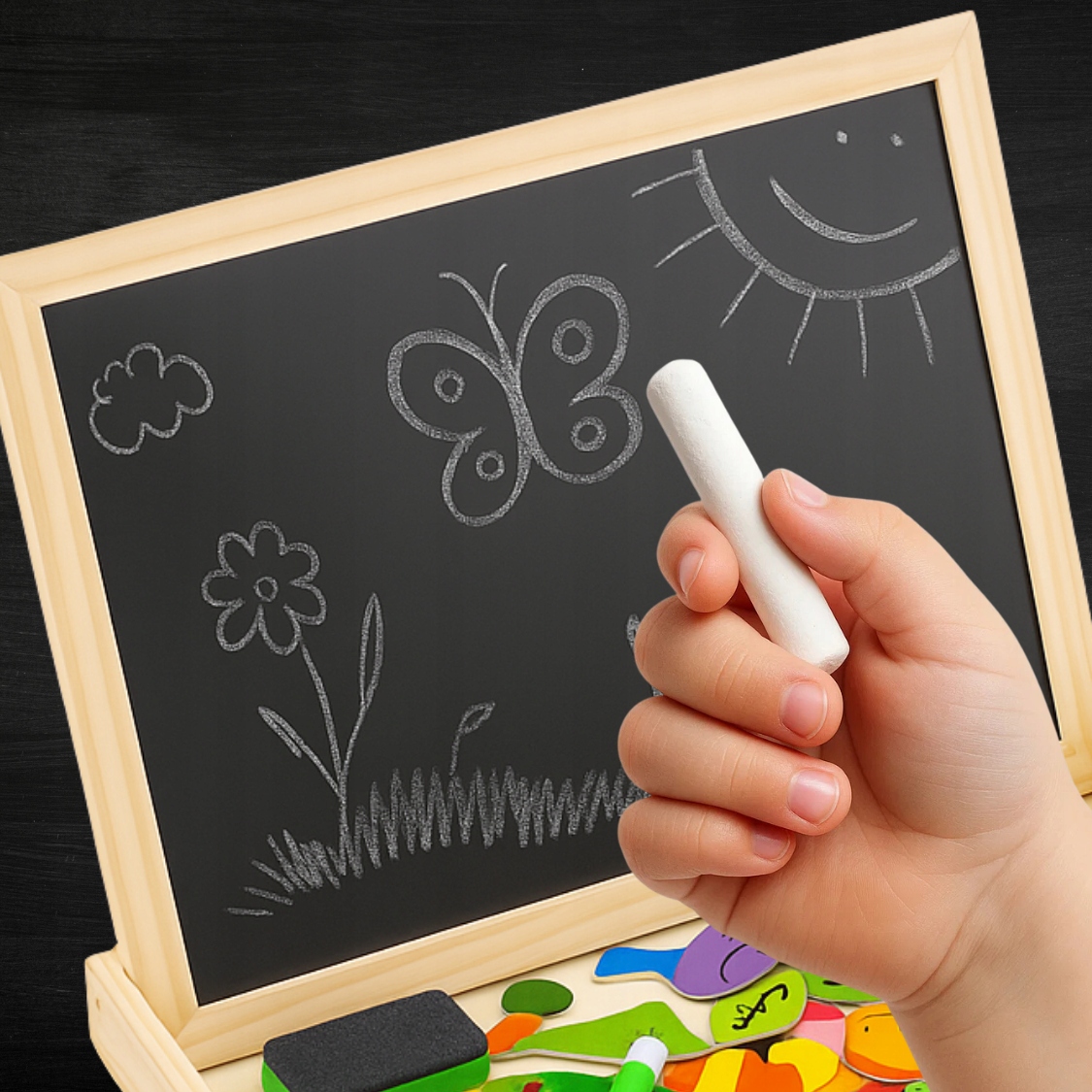 ➡️ ДВУСТОРОННЯЯ ДОСКА - одна сторона - белая магнитная поверхность, другая - черная доска для письма мелом. Это дает ребенку два разных способа игры и обучения.