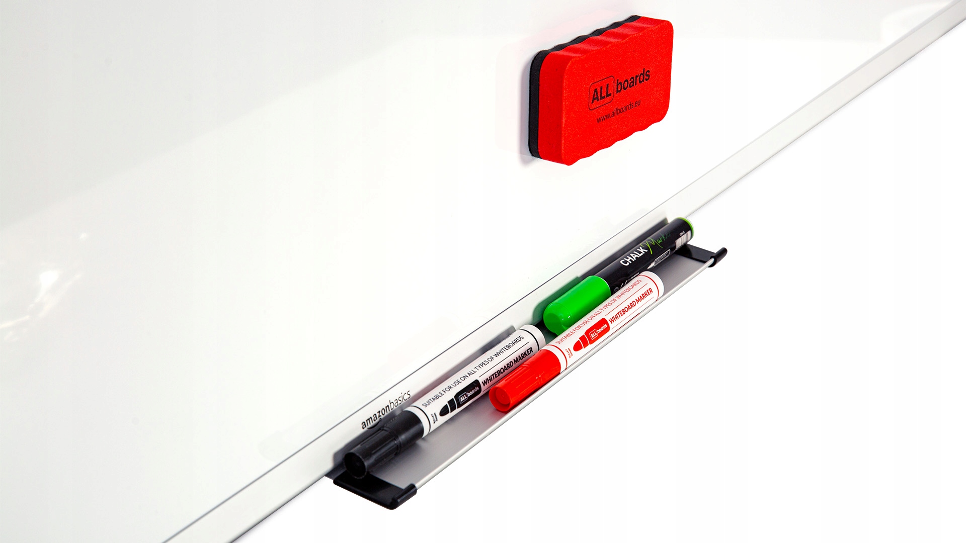 - РАМКА – прочная конструкция из алюминия. в элегантном сером цвете. Доска оснащена полкой для маркеров