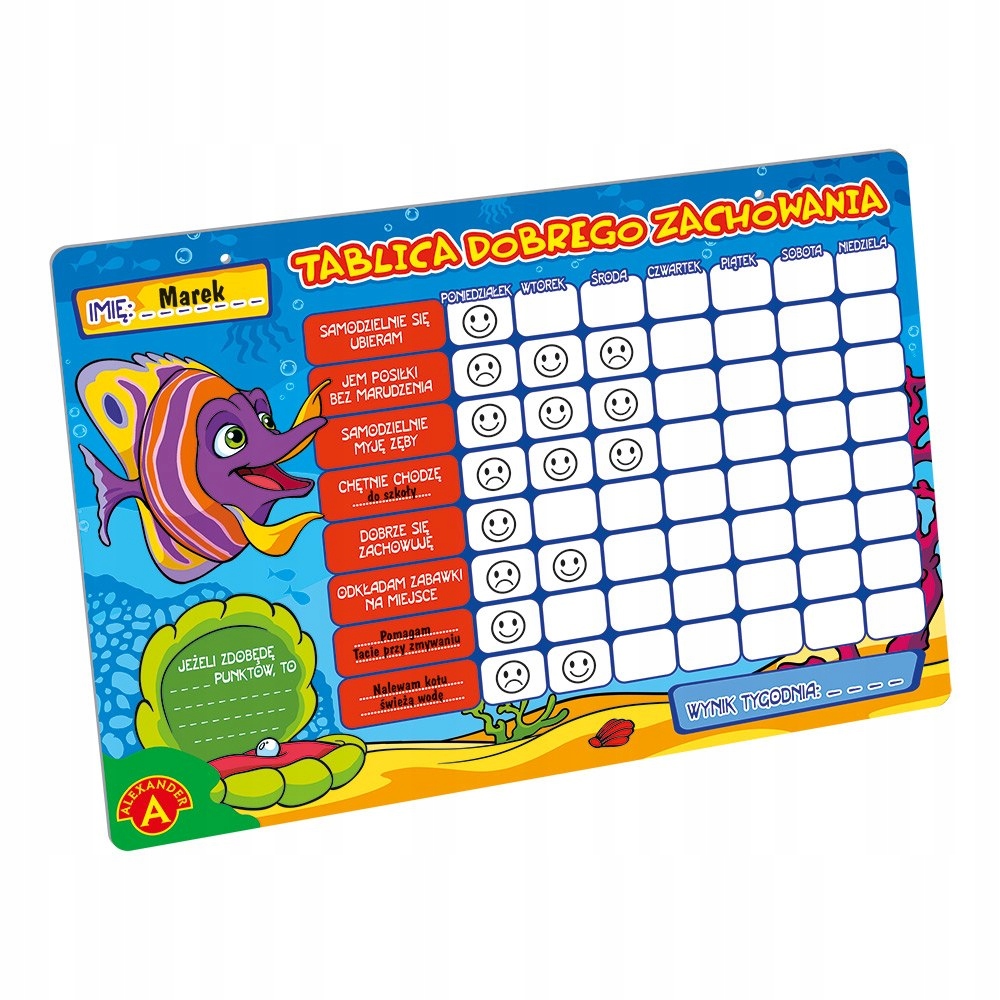 Уникальное обучающее пособие. Доска позволяет фиксировать поведение ребенка в виде баллов (магнитные штампы с изображением улыбающейся рыбки) и отрицательных баллов (магнитные штампы с якорем на красном фоне). Соответствующее количество набранных баллов позволяет ребенку выиграть заранее определенную награду.