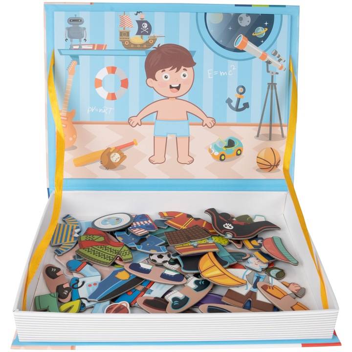 Магнитная книга для одежды - это игрушка - для маленьких любителей моды. Мальчик уже ждет, чтобы одеться в модных тематических стилизациях! Творческая игрушка состоит из книги, карт с готовыми предложениями по стилю и набора из 59 магнитов в форме различных элементов: прически, одежды, головных уборов и различных аксессуаров.