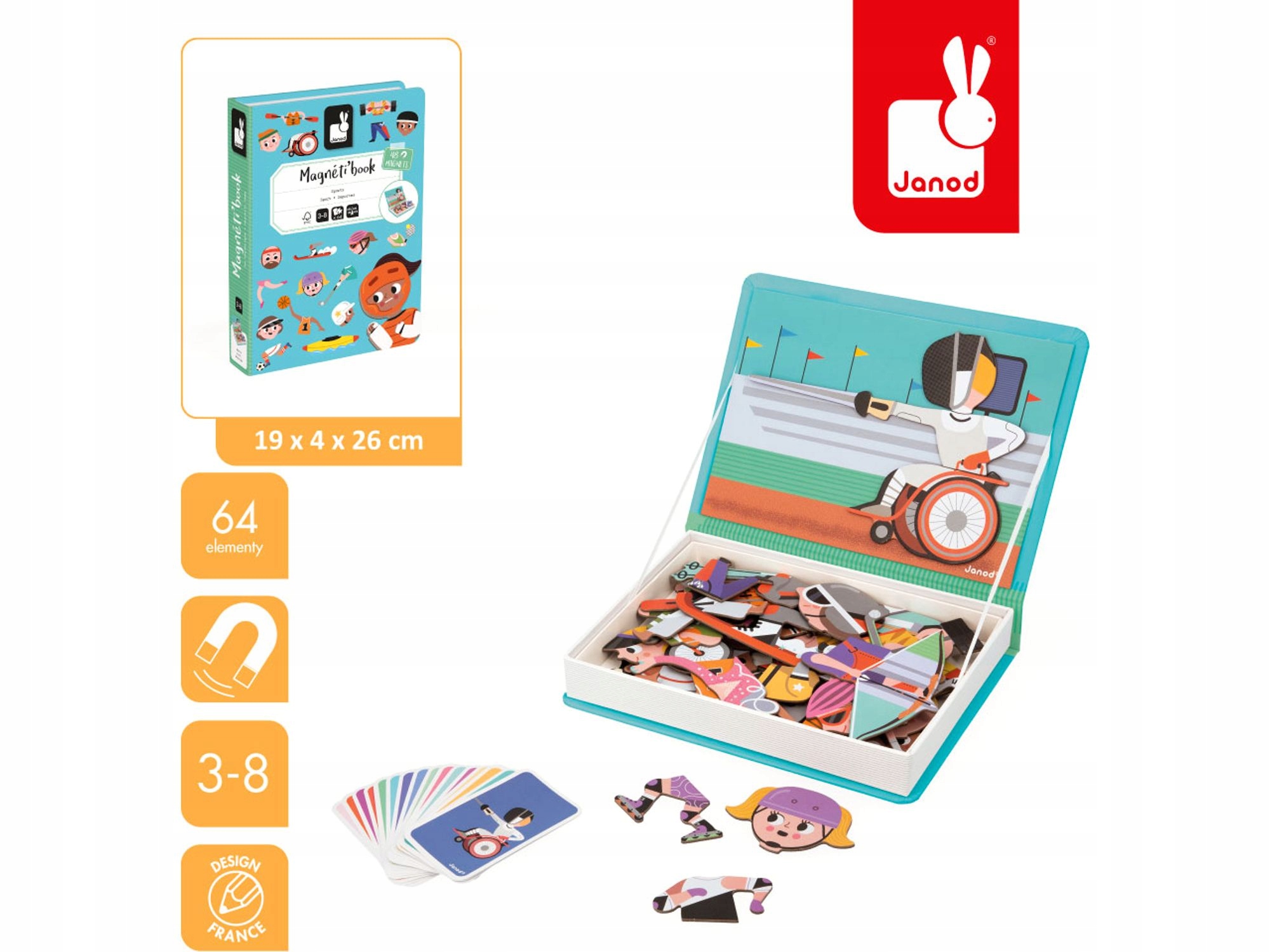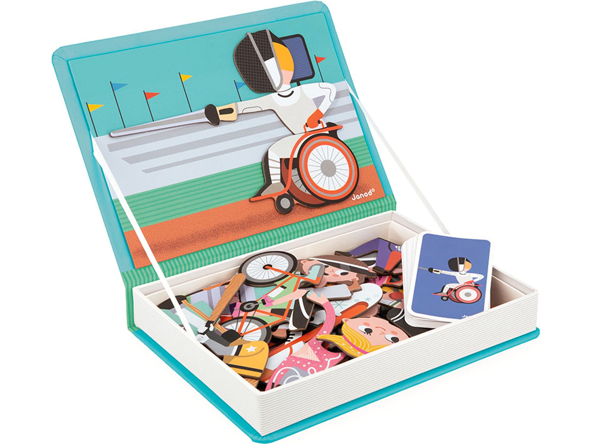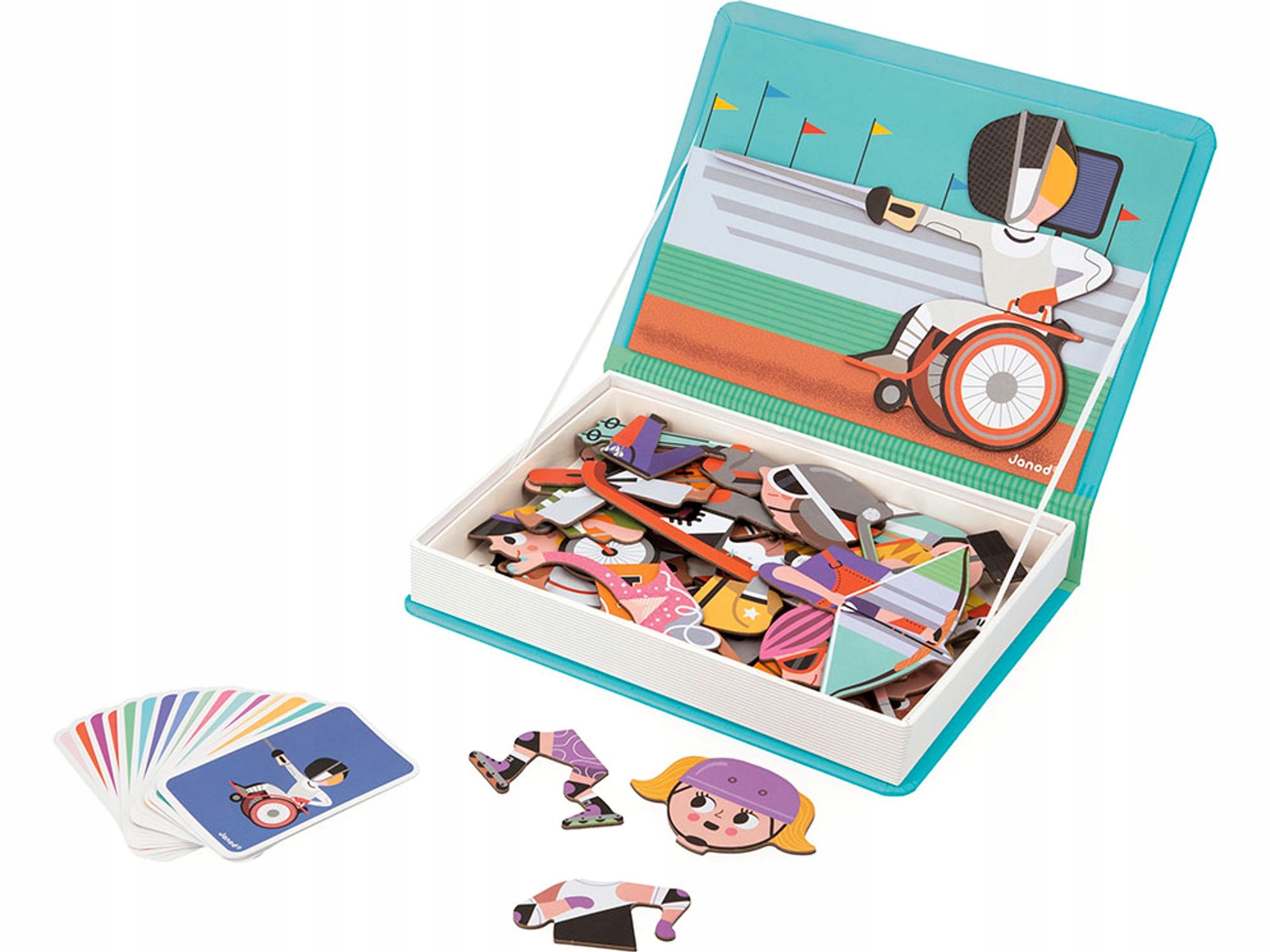 Красивая раскладная коробка в виде книги имеет магнитную стенку, на которой наш малыш может создавать картинки, связанные со спортсменами. Присутствуют отдельные части тела игроков и атрибуты спортсменов, например, арбалет или байдарка. Ребенок может построить представителей таких дисциплин, как: футболиста, теннисиста, баскетболиста, гольфиста и даже фехтовальщика, сидящего в инвалидной коляске.