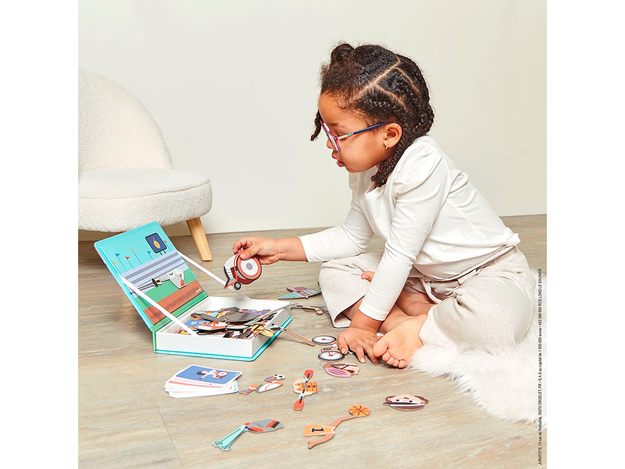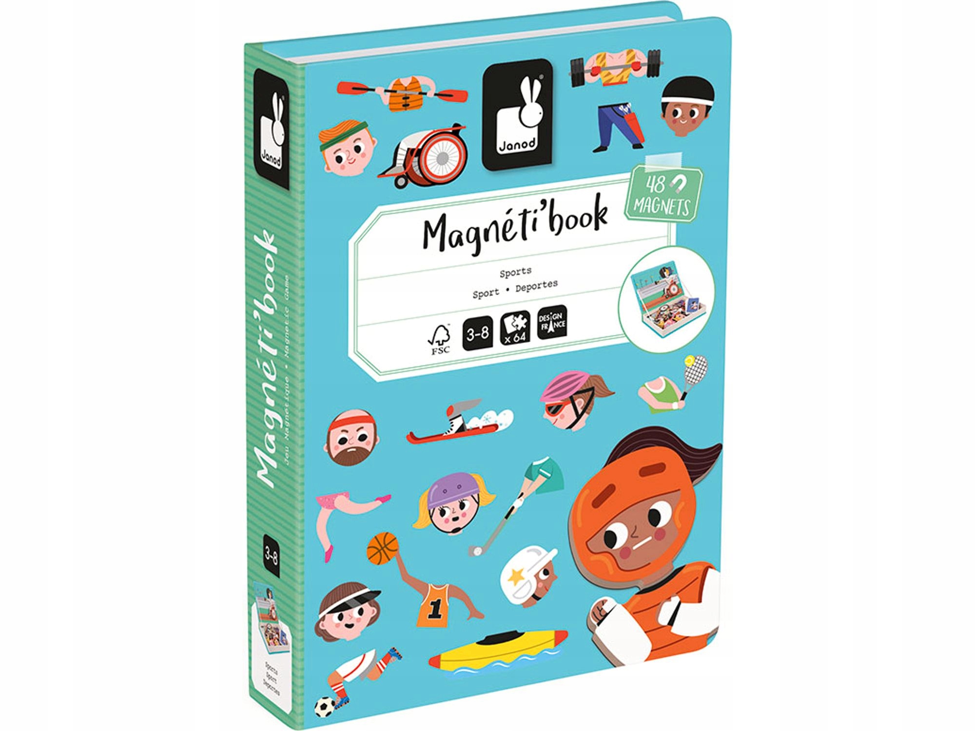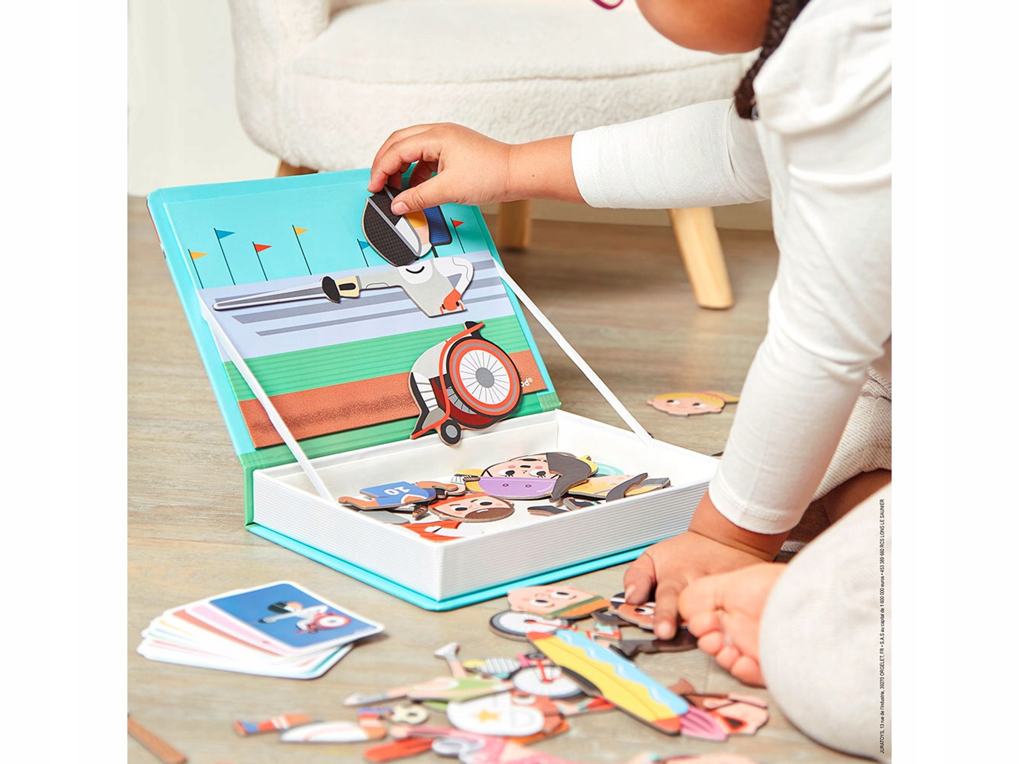 Красивая раскладная коробка в виде книги имеет магнитную стенку, на которой наш малыш может создавать картинки, связанные со спортсменами. Присутствуют отдельные части тела игроков и атрибуты спортсменов, например, арбалет или байдарка. Ребенок может построить представителей таких дисциплин, как: футболиста, теннисиста, баскетболиста, гольфиста и даже фехтовальщика, сидящего в инвалидной коляске.