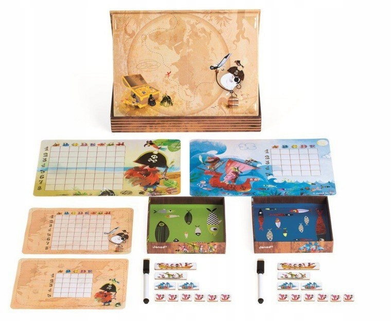 Игра Корабли от французского бренда Janod представляет собой уникальную версию знаменитой игры о морском бою. Вместо бумаги и карандаша Джанод предлагает инновационное решение — красиво иллюстрированные корабли в виде магнитов, которые размещены на двух магнитных досках с пиратским мотивом. У каждого игрока есть 10 корабельных магнитов. Кроме того, игроки получают стираемые маркеры, карты для обозначения пораженных кораблей противника и ластик. В сказочно оформленный набор также входят специальные планшеты, которые позволяют противникам вести морской бой, не наблюдая за флотом противника. Доски с двумя уровнями сложности позволяют детям младшего и старшего возраста участвовать в игре. Игра стимулирует воображение, стратегическое мышление и планирование. Отличное развлечение для всей семьи! Игра была разработана во Франции и упакована в эстетичную картонную коробку, идеальную для подарка.