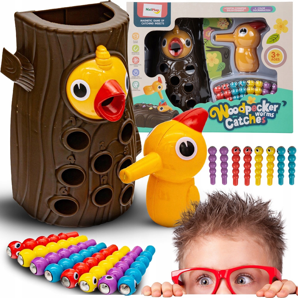 Благодаря магнитным элементам в игру можно играть где угодно — батарейки не требуются! Задача ребенка — взять на себя роль птицы-матери и с помощью птицы вытащить червячков из бревна и точно поместить их в клюв голодному птенцу.