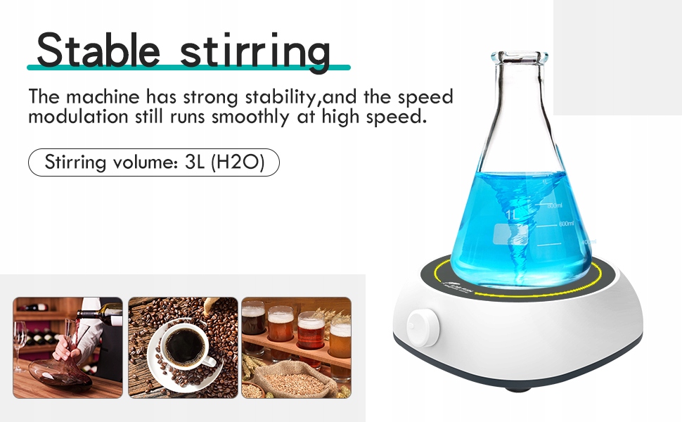 Благодаря максимальной мощности 3L, мешалка подходит для лабораторных экспериментов, химических процессов и домашнего пивоварения. Он также будет работать в области пищевой промышленности и биотехнологии, где требуется тщательное смешивание большого количества веществ.