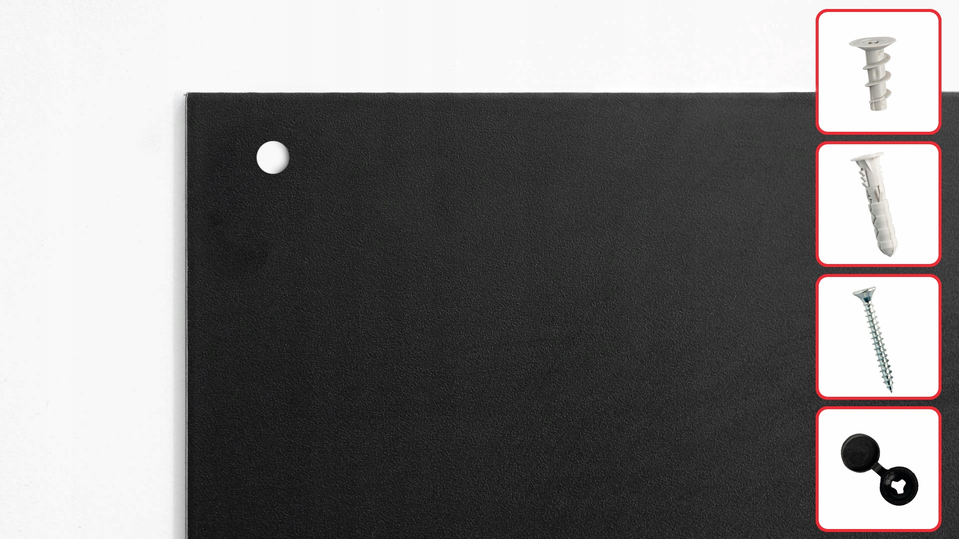 Магнитные панели можно прикрепить к стене с помощью монтажных комплектов, состоящих из дюбелей и конических шурупов. Выбор типа шурупов не случаен, ведь после установки шуруп прячется под специальную заглушку в цвет панели.