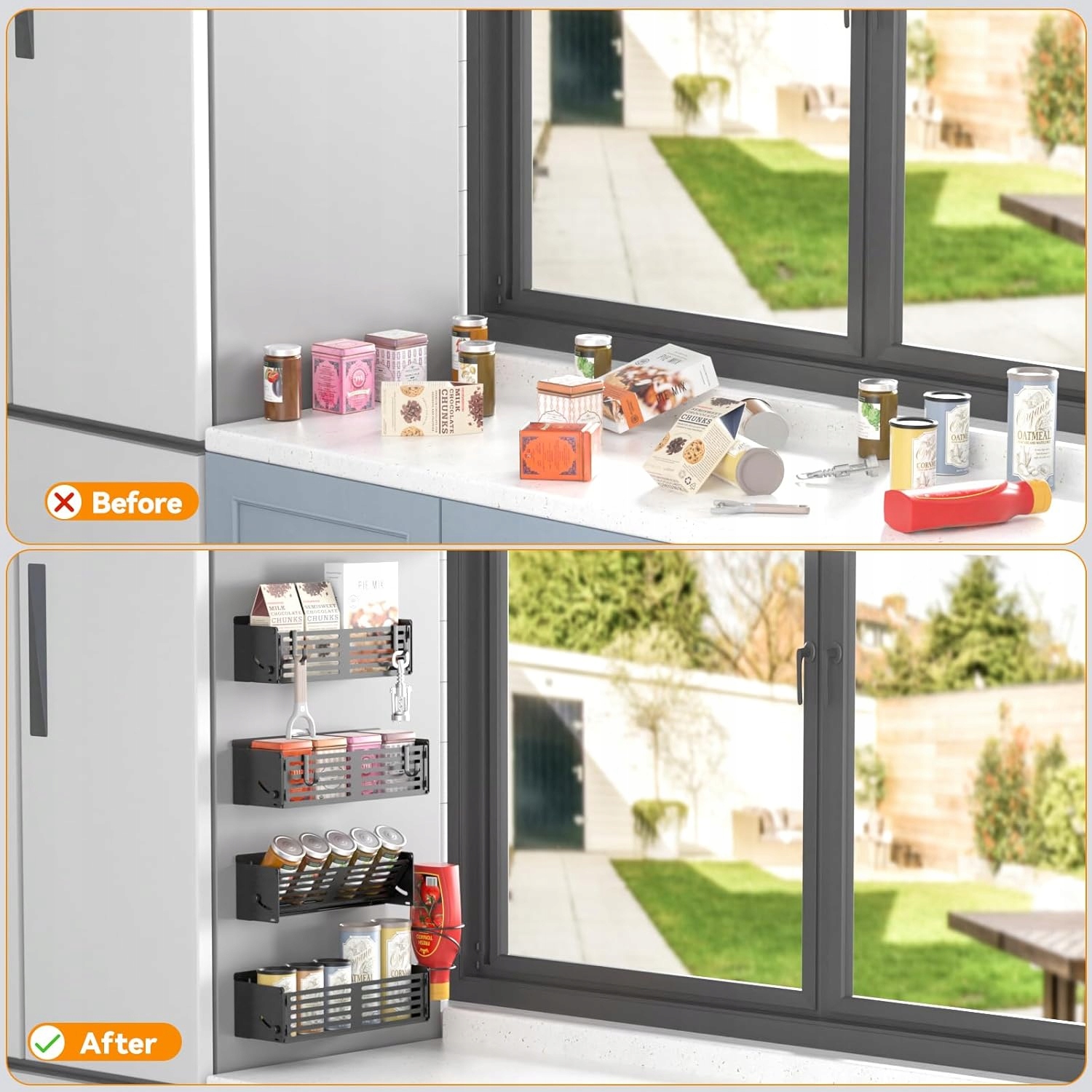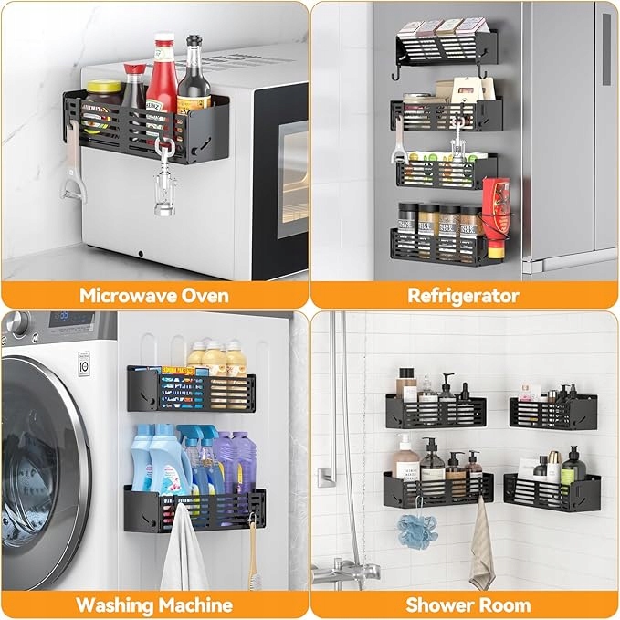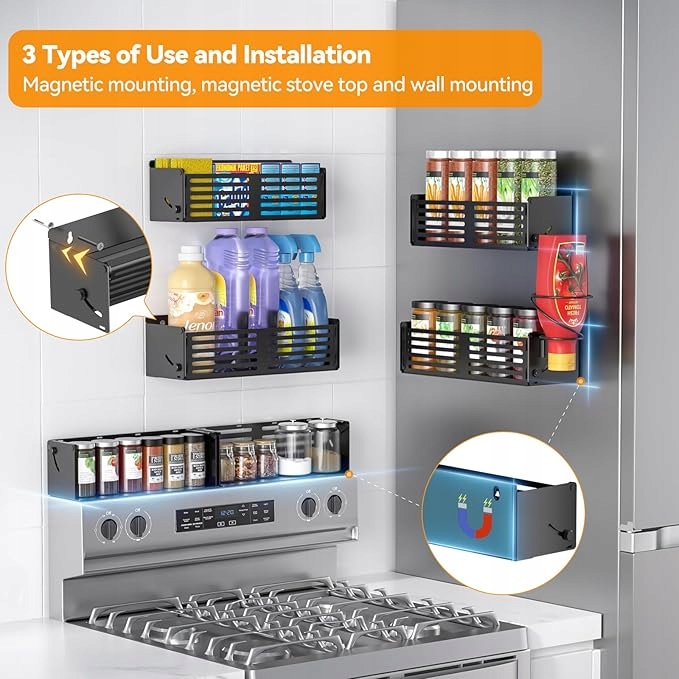 set 4 Магнитная кухонная организаторы - идеальное решение для любой кухни, особенно для маленькой или современной. Благодаря сильным магнитам вы можете легко прикрепить их к холодильнику, духовке, металлической стенке или другой стальной поверхности. Больше нет беспорядка - все специи, чашки и аксессуары всегда будут под рукой.