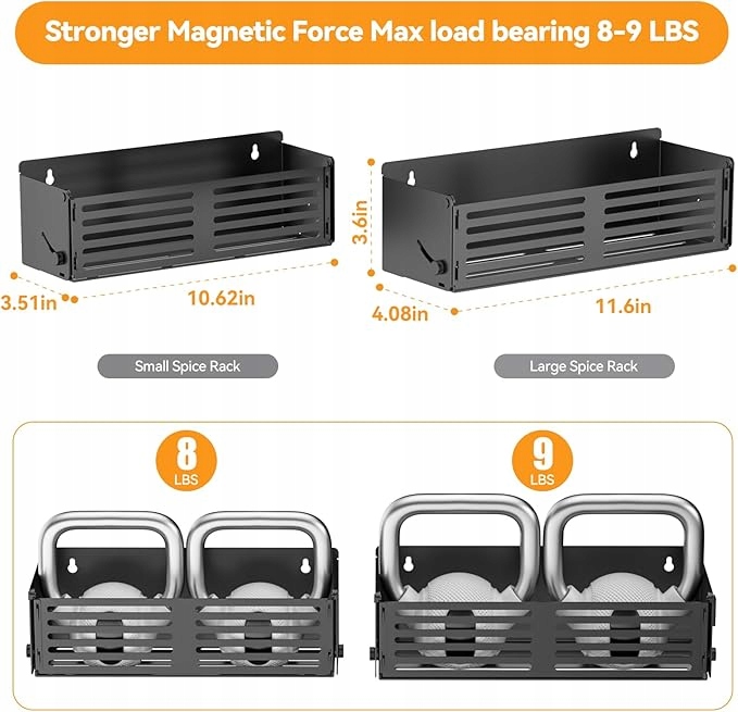 Наши специи доступны в двух разных размерах, большие и средние, чтобы удовлетворить ваши различные потребности для хранения разных предметов. Магнитное хранение на кухне обеспечивает много места, большой размер может удерживать до 12 банок для специй. Помогает создать больше места для хранения.