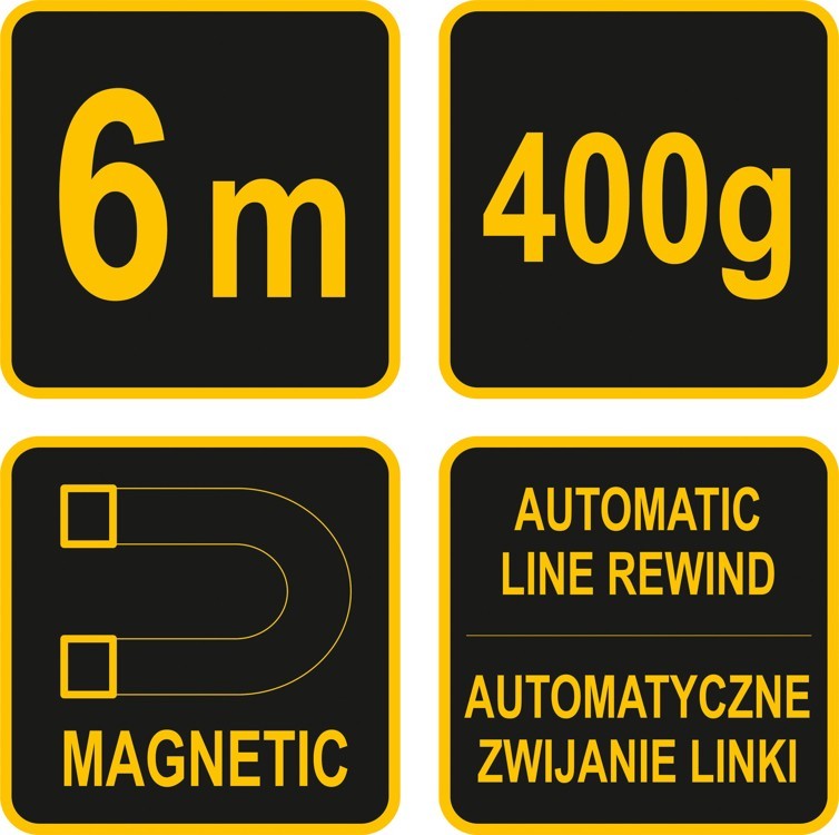 Кладочный отвес массой 400 г, подвешенный на веревке длиной 6 м. Кассета оснащена механизмом автоматической намотки кабеля, очень сильным магнитом для крепления отвеса к металлическим элементам конструкции и острым шипом, облегчающим крепление к дереву или другим строительным материалам. В корпусе имеется отверстие, позволяющее легче повесить отвес на бетонные стены /предварительно забив в них гвоздь/.