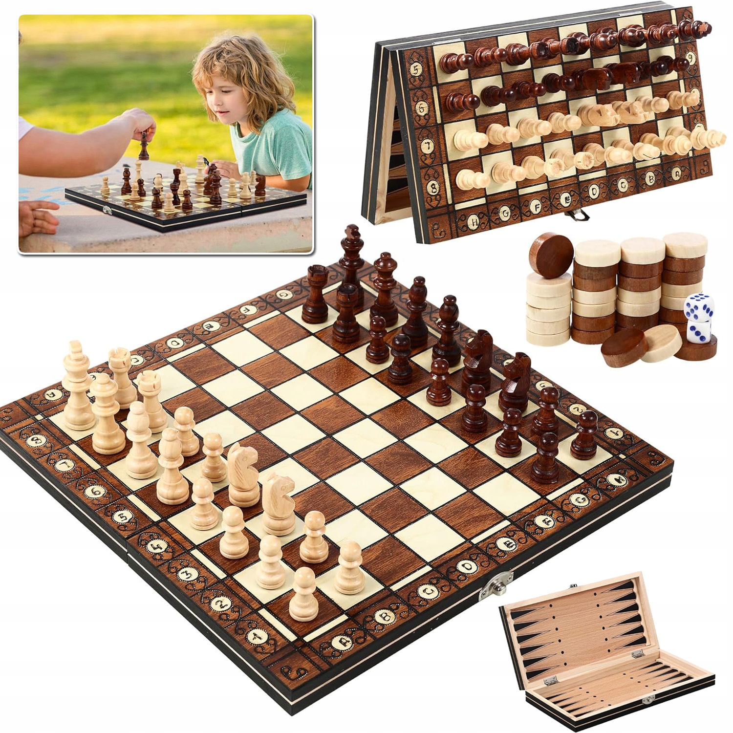 ✨【Складная шахматная доска и головоломка】: Набор шахмат с деревянной складной конструкцией, коробку можно хранить внутри шахматных фигур, можно переносить, не занимает много места. Вы и ваши дети можете играть в шахматы, чтобы развивать навыки решения задач и прогнозирования, а также тренировать память.