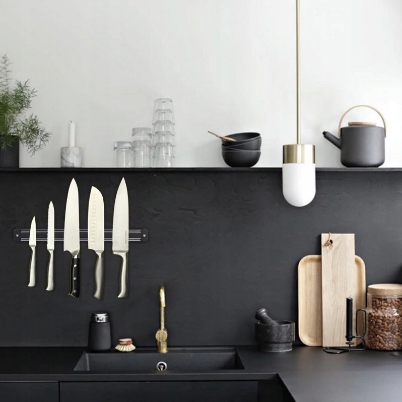 Магнитная полоса длиной 33 см, оснащенная сильными магнитами, — современное решение для каждой кухни. Просто поместите нож на полоску, чтобы она встала на место!