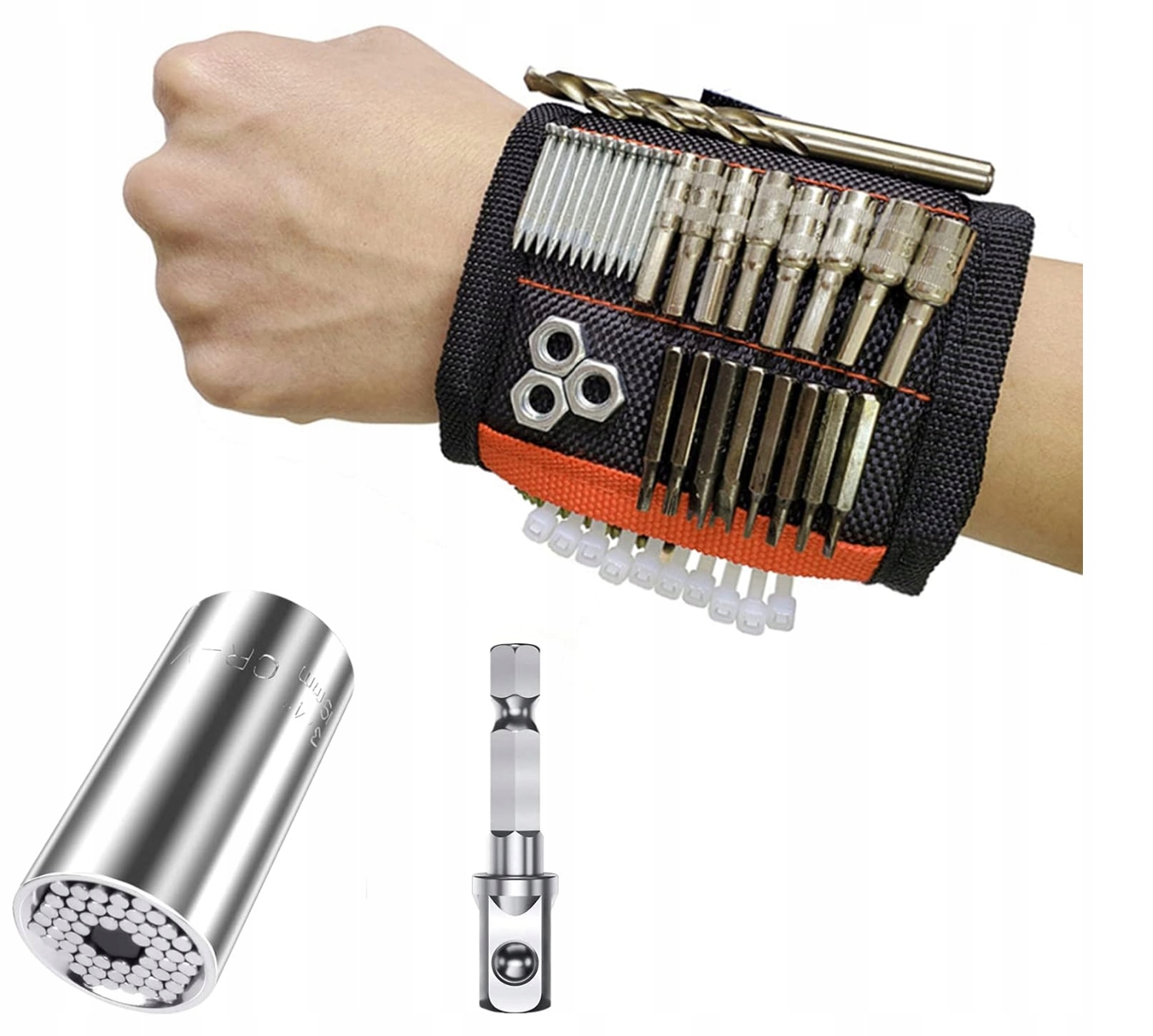 【Магнитный браслет】Идеальный дизайн, 15 мощных магнитов N40 для хранения инструментов. Два уникальных кармана для немагнитных предметов. 100% баллистический полиэстер 1680D, водонепроницаемый. Мягкая сетка сзади, свободный воздухообмен.