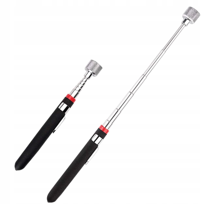 - Телескопическая стрела до 65 см. длиной см с магнитом на конце, предназначенным для подъема металлических предметов, таких как винты, гайки, шайбы и т. д.