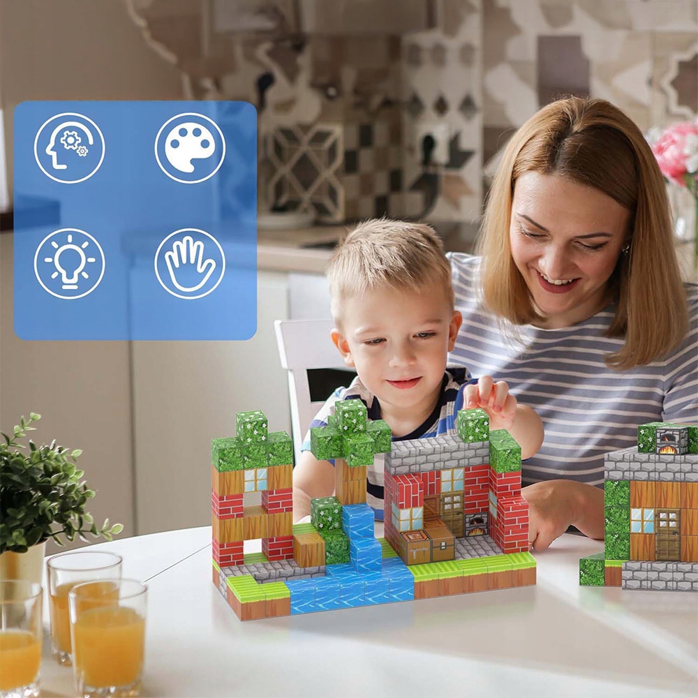 Сочетание УФ -технологии и магнетизма, эти структурные блоки предлагают более яркий и реалистичный опыт, чем обычные красочные кубики. Благодаря различным дизайнам, таким как вода, трава, дерево, камень, лист, кирпич, цветок и окно, дети могут украсить свой маленький замок, построить красный город с кирпичом для своих кукол и даже создать лесное парковку для своих автомобилей.