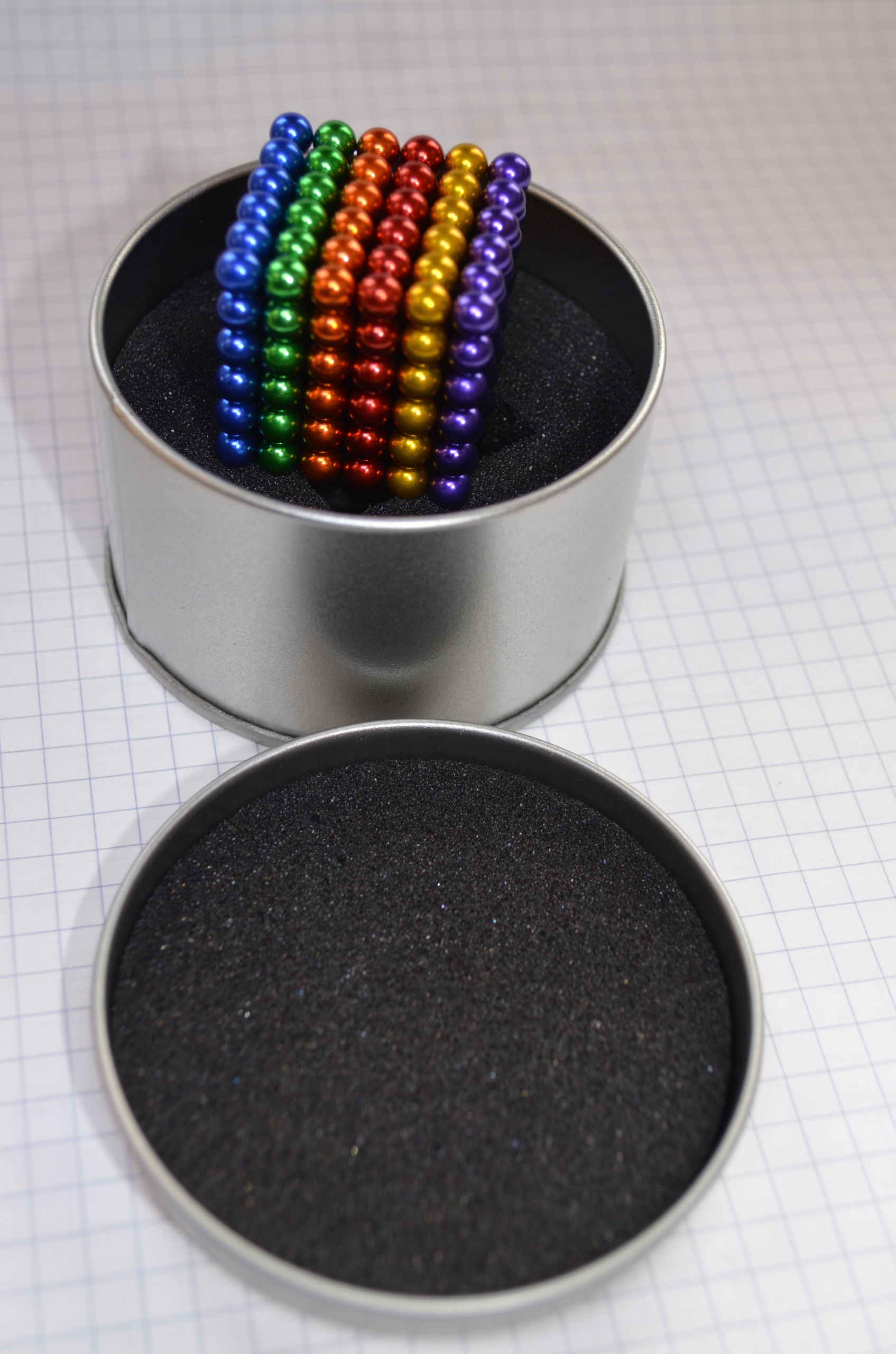В комплект входят 216 намагниченных шариков диаметром 5 мм и элегантная металлическая коробка.
