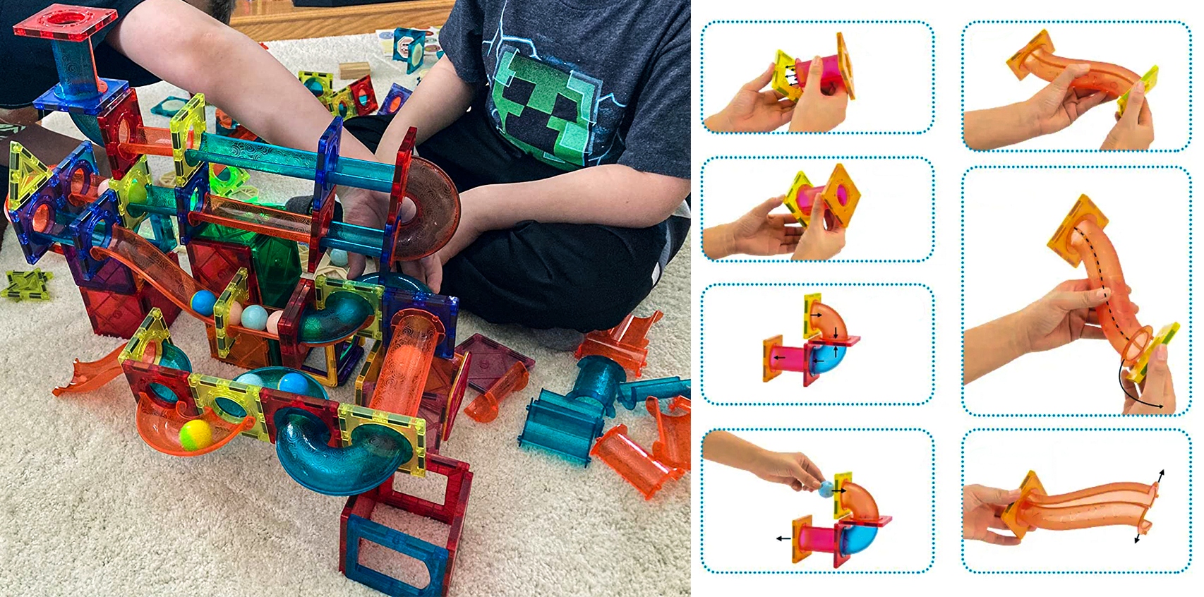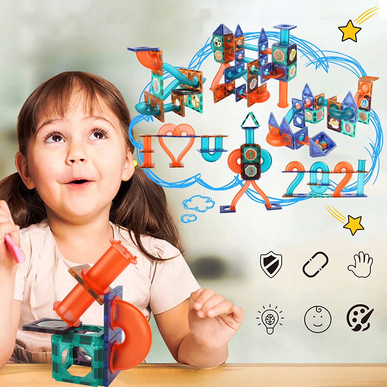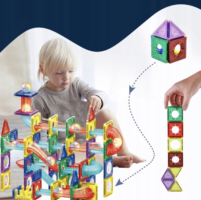 Блоки соединяются друг с другом с помощью встроенных СИЛЬНЫХ магнитов, между блочными конструкциями размещаются направляющие и трубы, воплощая в реальность даже самые сложные конструкции. Мы можем перебрасывать мячи через горки, которые входят в комплект. блоки из последней поставки 2023 года позволят вам компоновать не только плоские фигуры, но и трехмерные 3D-фигуры.