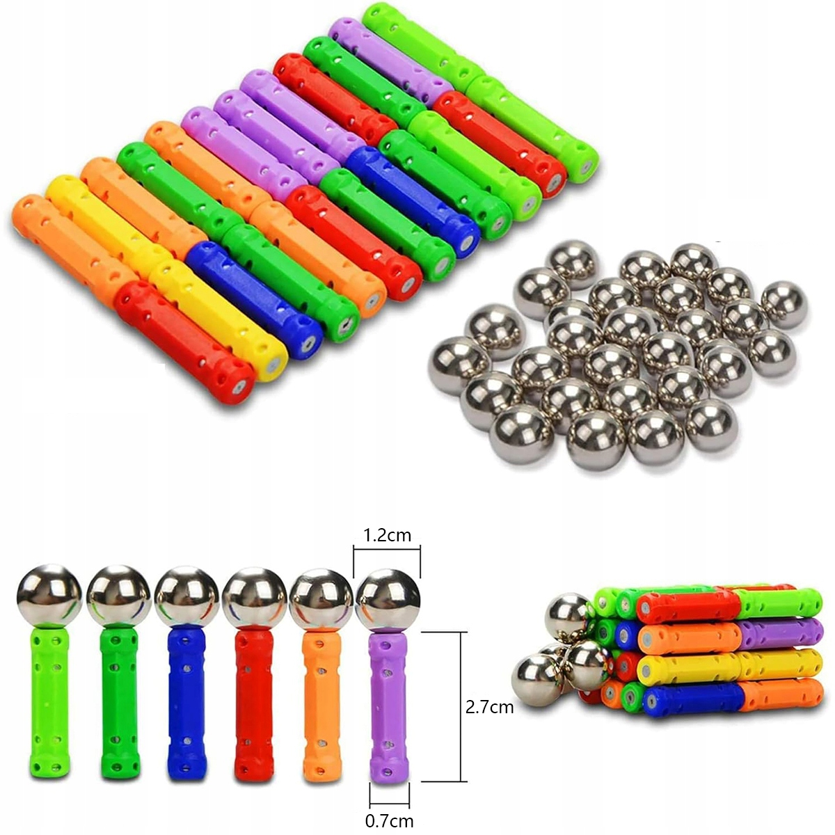 - Набор из 206 предметов: 142 магнитных стержня + 64 магнитных бусины.