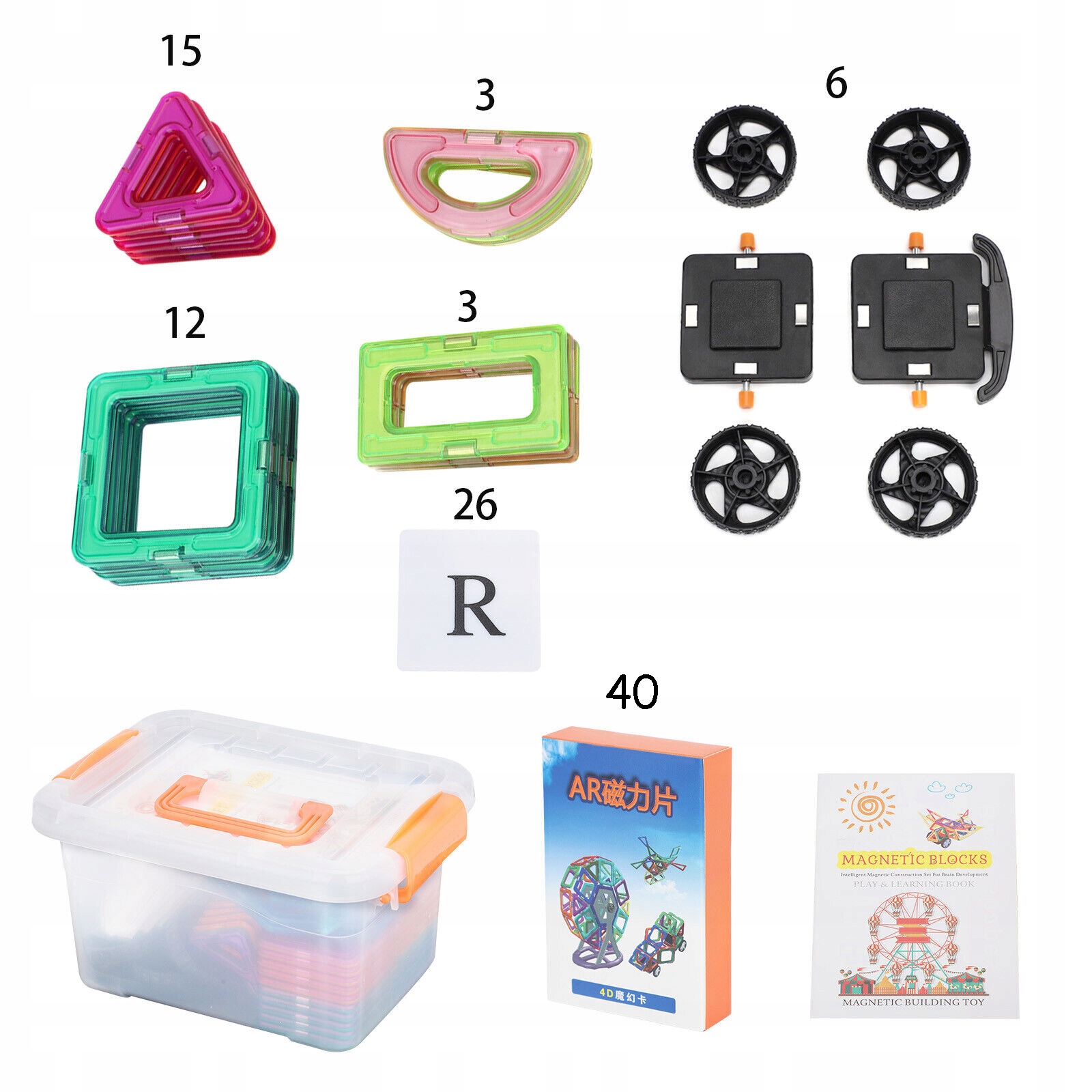 🎈🎈 【Полный набор конструкторов】 В набор из 105 предметов входят 12 квадратов, 15 треугольников, 3 полукруга, 3 маленькие прямоугольники, 26 букв, 6 маленьких машинок, 40 карточек 4D, 1 инструкция по эксплуатации, 1 коробка для хранения, чтобы сразу приступить к сборке и получить неограниченное удовольствие.