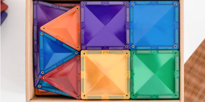 В коробке вы найдете большие и маленькие квадраты, а также три типа треугольников шести ярких цветов радуги. Такой набор элементов позволяет создавать как плоские 2D-мозаики, так и пространственные 3D-здания: дома, замки, фермы, зоопарки, парковки, башни, ракеты, сортировочные коробки или красочные пазлы. При этом ребенок естественным образом узнает, как работает магнит, взаимосвязь между формами, а также основы дизайна и инженерии.