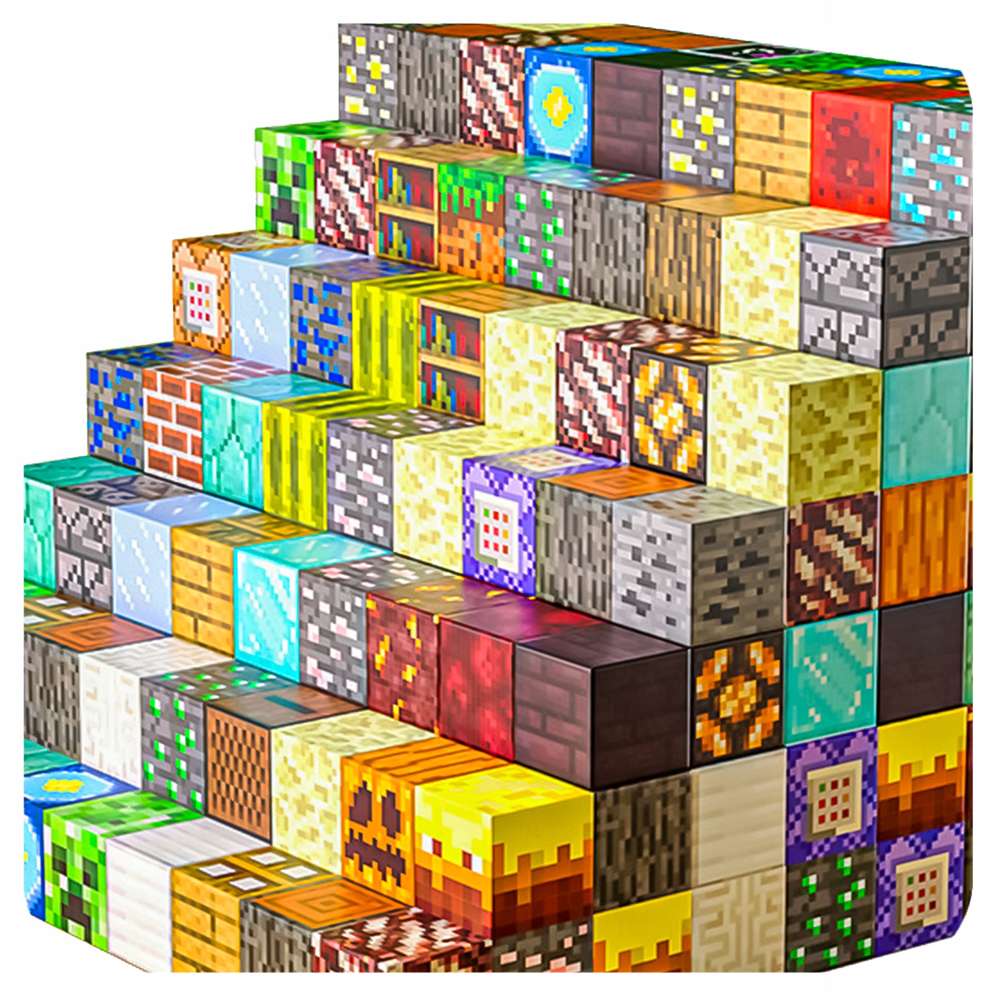 Каждый блок имеет реалистичный 3D-принт, напоминающий траву, дерево, кирпич, лаву, камень, стекло, тротил, сундуки, водные или минеральные блоки.