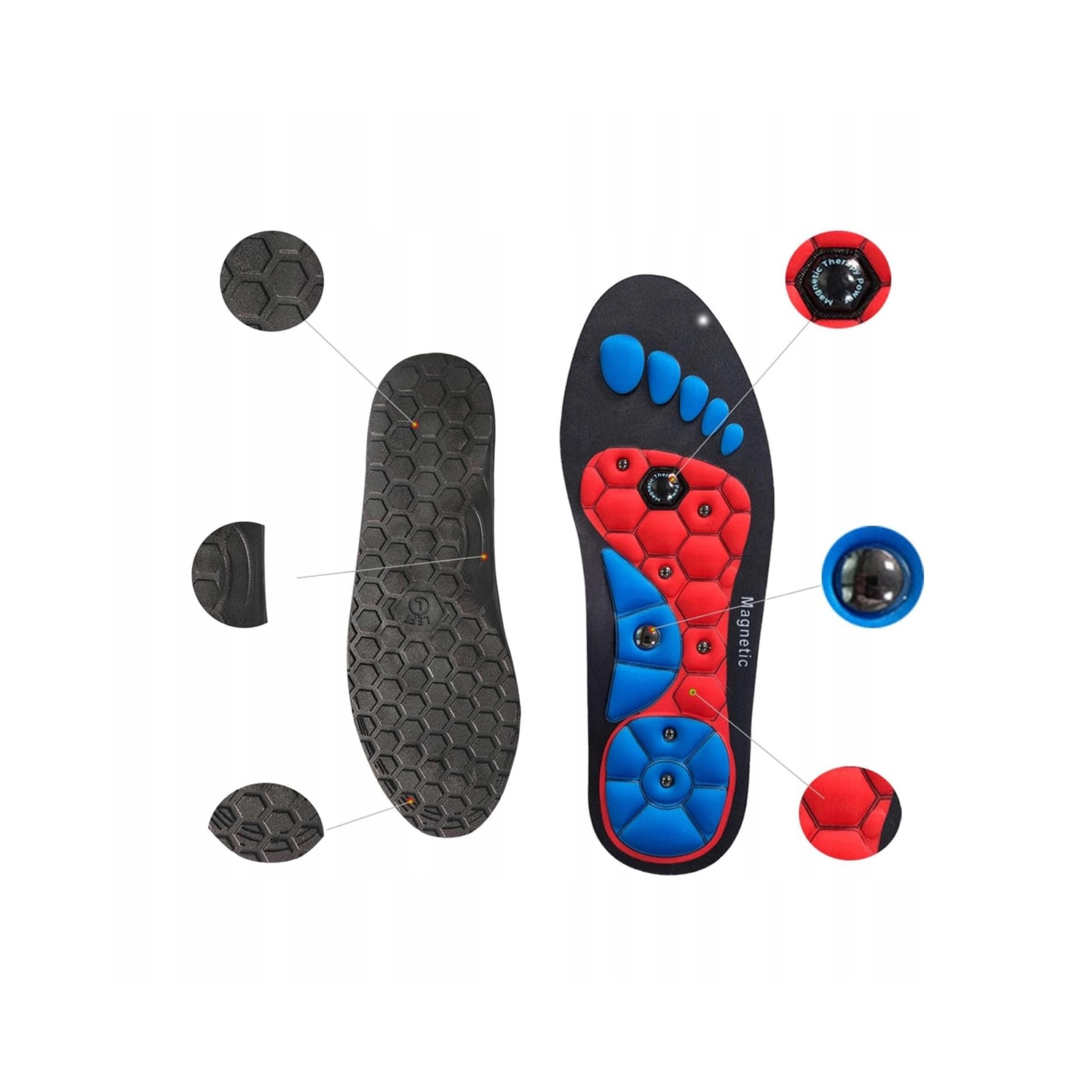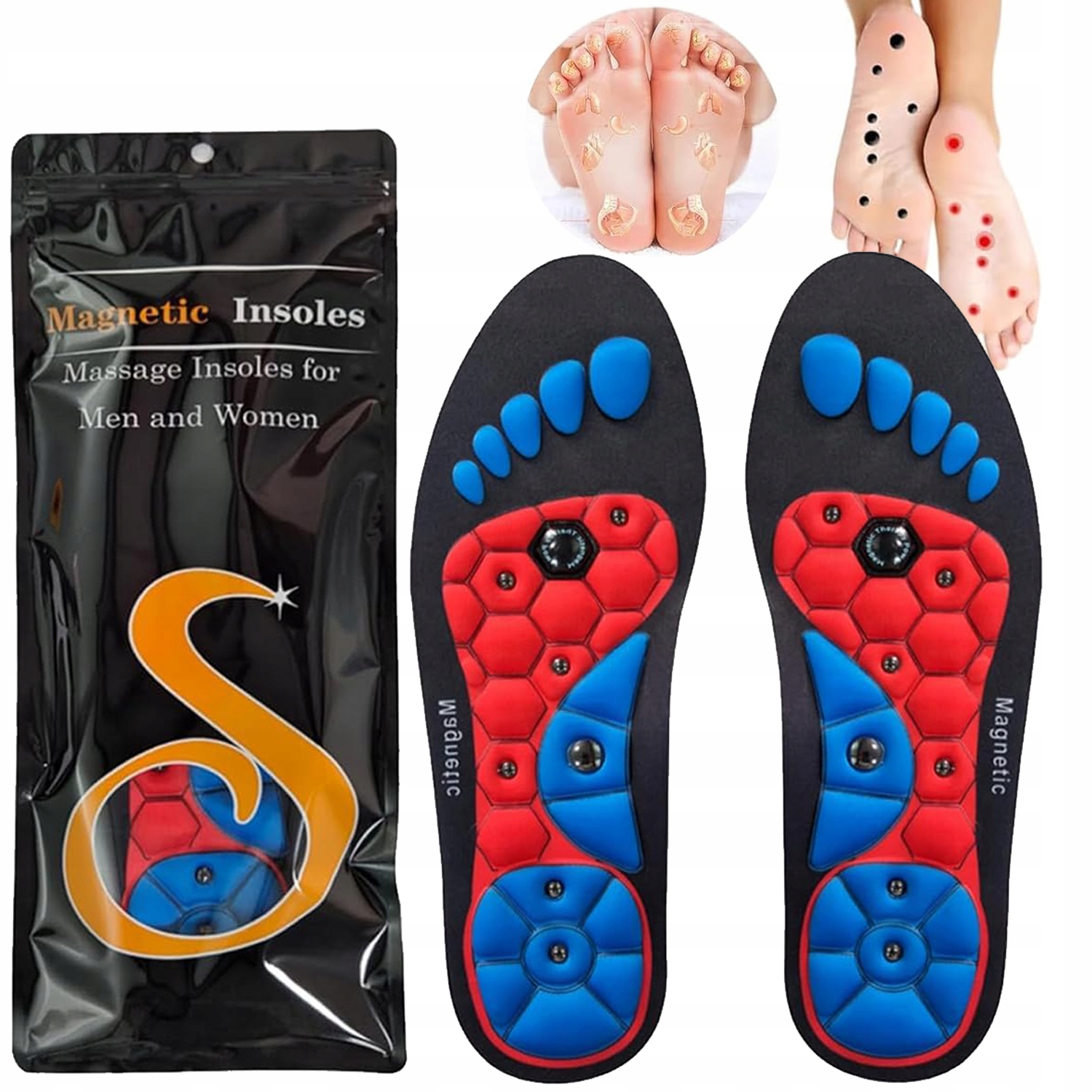Магнитные стельки, которые мягко массируют ноги во время ходьбы, стимулируют кровообращение, помогая уменьшить боль в мышцах ног и ступней. Инновацией продукта является размещение на каждой стопе по 8 магнитов, что улучшает кровоток. Поверхность стелек перфорирована, что позволяет ногам свободно дышать.