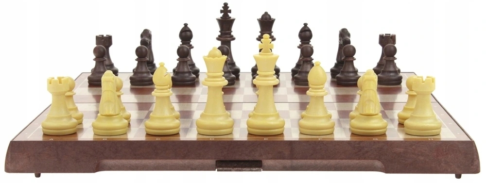 - 16 магнитных кремовых деталей. и 16 магнитных коричневых фигур для игры в шахматы.