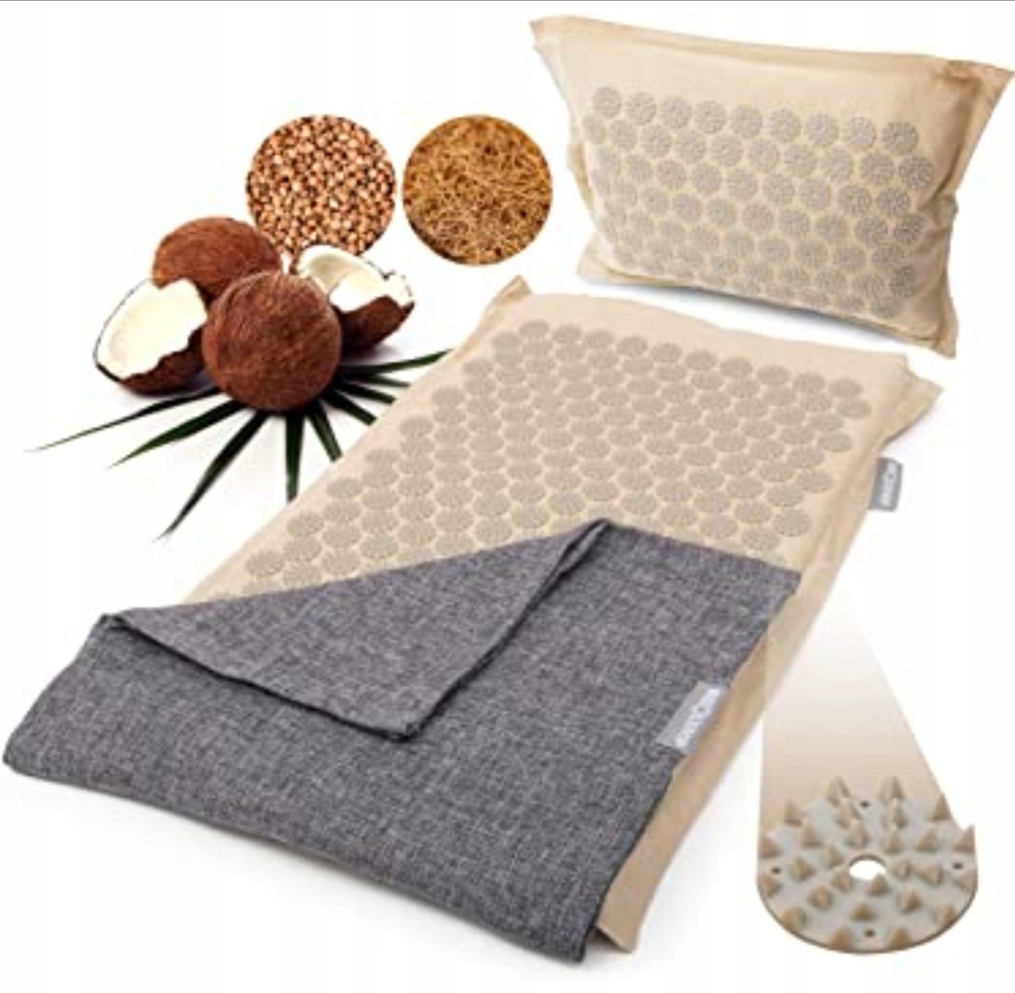 Используются практически исключительно биологические материалы. Внешний материал коврика и подушки изготовлен из 100% хлопка. Под ней находится подушка с наполнителем. Здесь используется лен и натуральный хлопок. Коврик для акупрессуры наполнен кокосовым волокном, а подушка для акупрессуры — капоком.