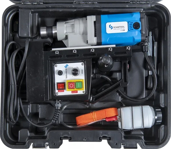 Подробнее о продукте:Плавная регулировка скорости от 100 до 600 об/мин. Магнитное основание с высокой магнитной силой 1,4 тонны Встроенная подсветка, указывающая на активность магнита Встроенный резервуар для охлаждающей жидкости В комплект входят следующие элементы: Транспортный кейс Съемная крышка для защиты от порезов при сверлении