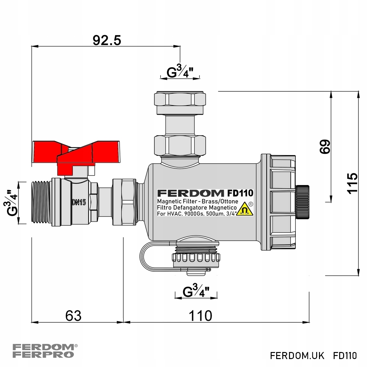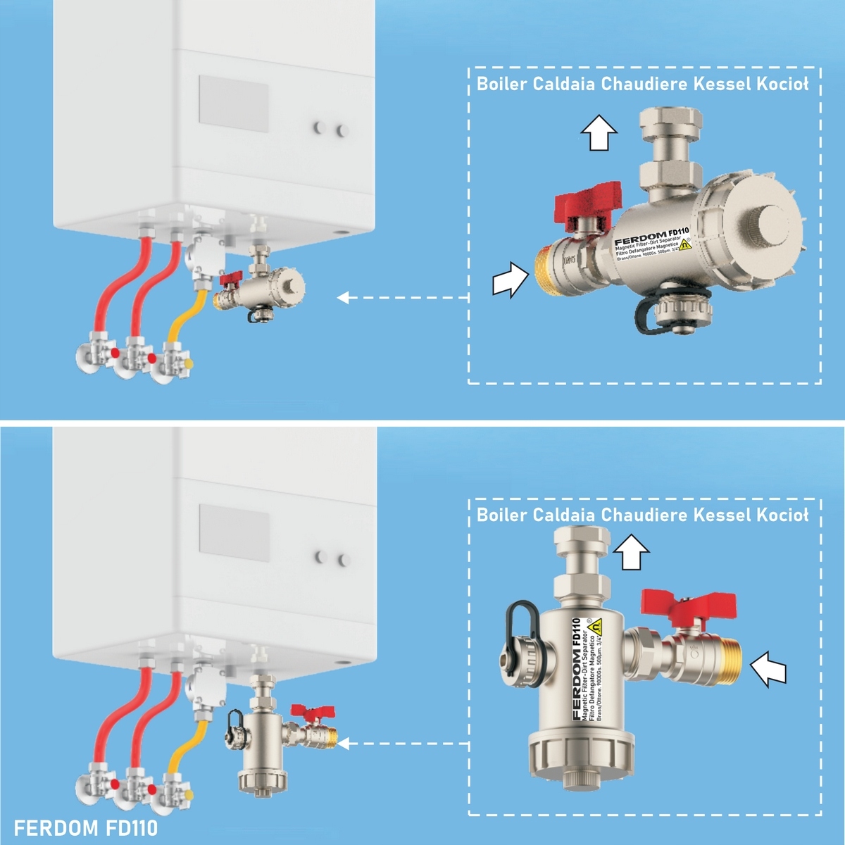 - Фильтр FD110 имеет очень прочный металлический корпус, металлическую крышку и магнитную втулку. Большинство производителей котлов центрального отопления рекомендует устанавливать магнитный фильтр вместе с новым котлом центрального отопления.