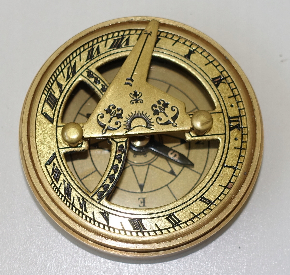 На этом аукционе я предлагаю компас с солнечными часами. изготовлен из латуни. Это современный экспонат, но сохранивший старые формы – точная копия. Очень привлекательный внешний вид и благородный материал могут стать отличным украшением письменного стола, коллекции или повседневным, но элегантным подарком.