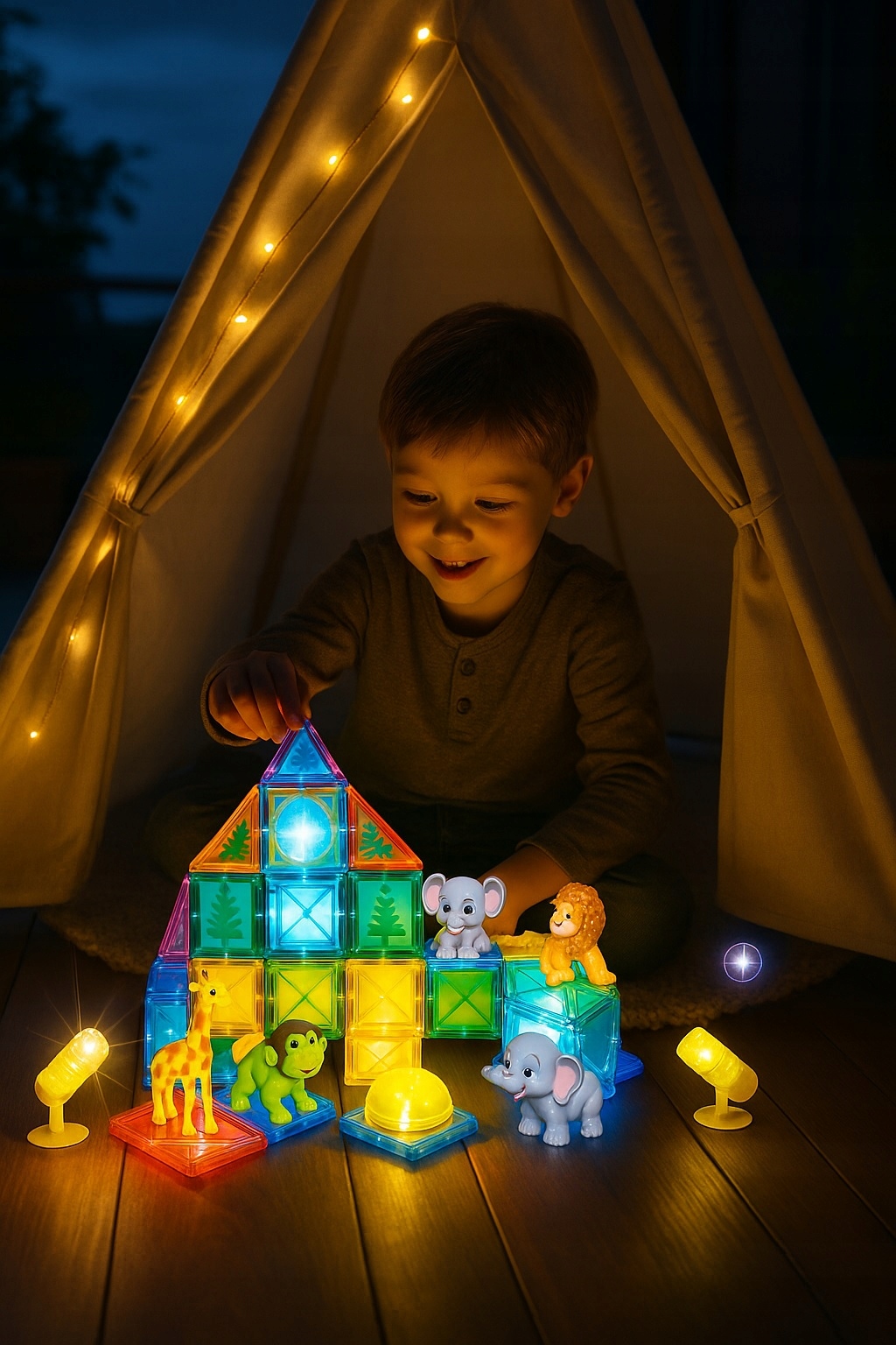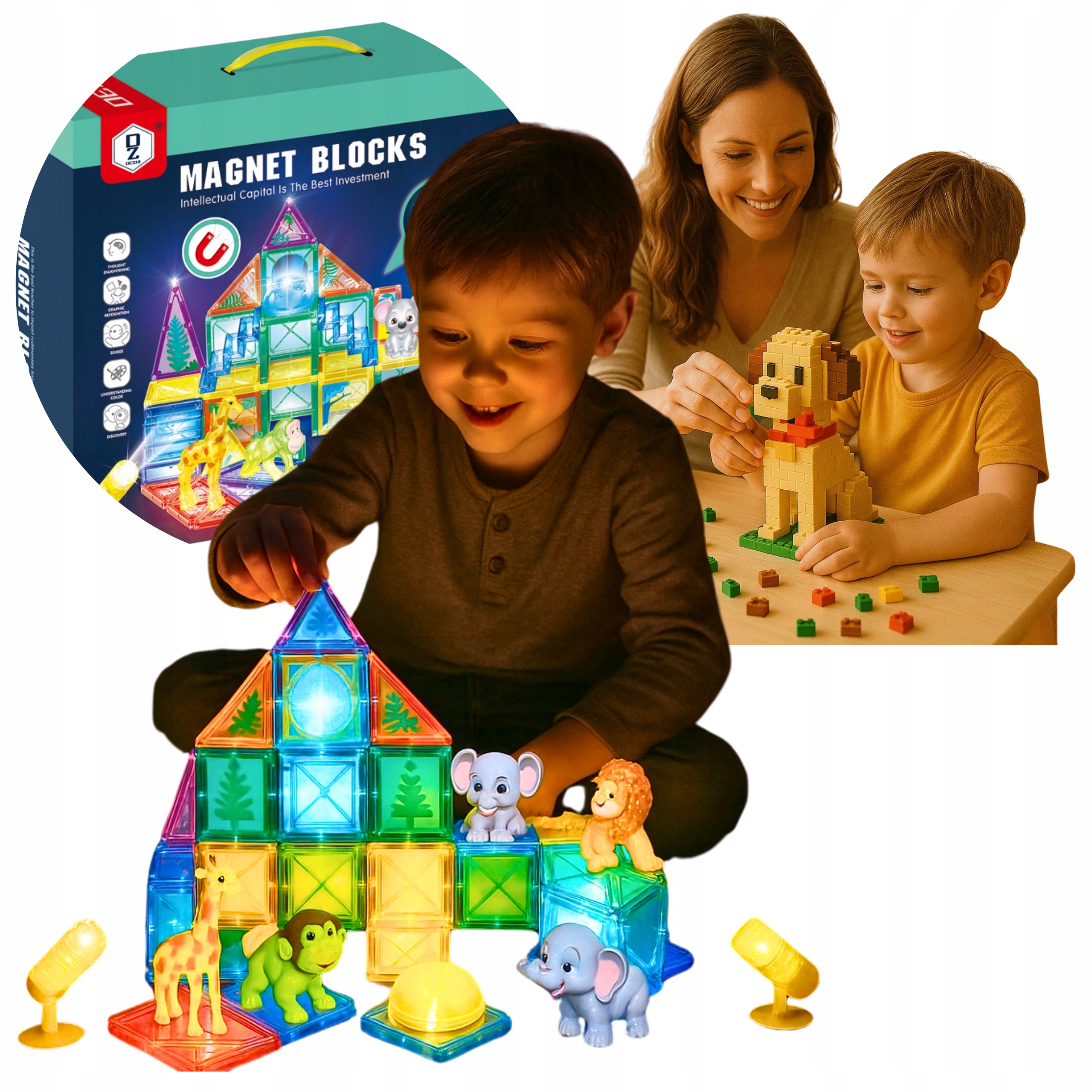 Магнитные блоки – это инновационная развивающая игрушка, сочетающая в себе творчество, обучение и безграничные возможности конструирования. Каждый набор состоит из различных форм – квадратов, треугольников, арок, трубок и световых модулей – изготовленных из прочного полупрозрачного материала ярких, привлекательных цветов. Мощные, безопасные магниты, встроенные в стены, позволяют детям легко объединять элементы в устойчивые конструкции и в то же время быстро разделять их, развивая мелкую моторику и умение распознавать формы.