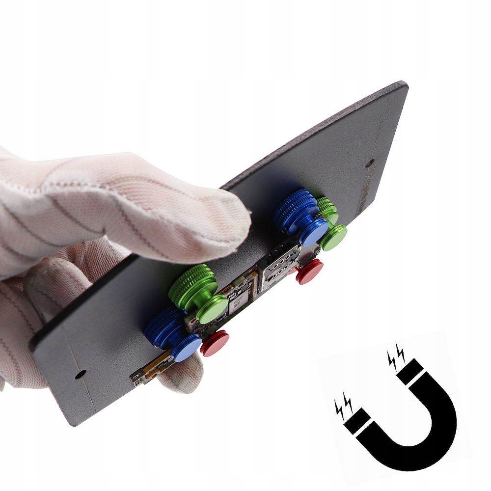 Магнитная рабочая пластина для ремонта печатных плат, чаще всего используется для работы с небольшими устройствами, такими как смартфоны, планшеты и другие устройства. Он удерживает доску в пазу с помощью 6 свободно регулируемых магнитов. Пазы в магнитах подходят для плитки толщиной 0,2-1,8 мм. Подставка очень устойчивая и качественная. Он устойчив к высоким температурам, поэтому его можно паять напрямую.