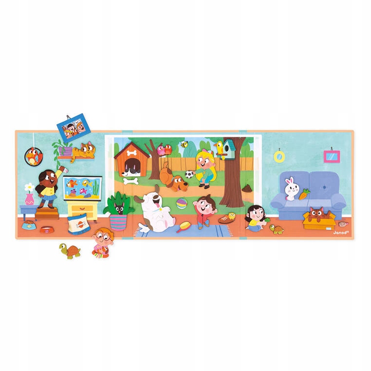 Magnetic Stories Pets из линии Magneti'stories французского бренда Janod содержит 30 магнитов - животные, их кроватки, игрушки, лакомства и т. д., являющиеся составляющими для создания оригинальной иллюстрации на складной тройной доске. Магниты позволяют создавать собственные истории с любимыми животными в качестве героев. Это отличное развлечение для всех творческих детей. Упаковка выполнена из жесткого картона в форме книги, которая в разложенном виде превращается в трехчастную магнитную доску. Все это выглядит очень эстетично и может стать прекрасным подарком.