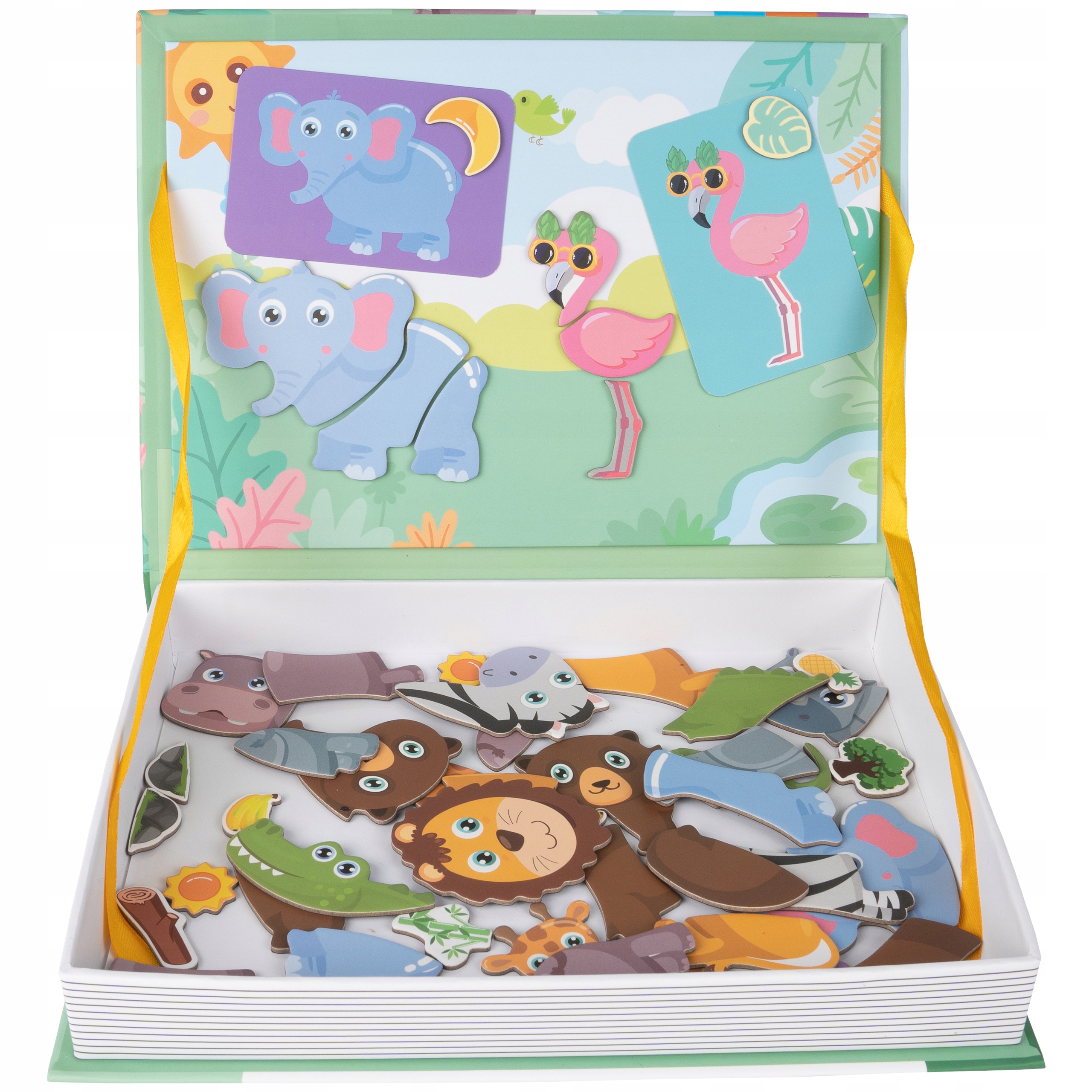 Креативная игрушка состоит из книги, карточек с готовыми фигурками животных и набора из 47 штук. магниты в форме животных, фруктов и растений.
