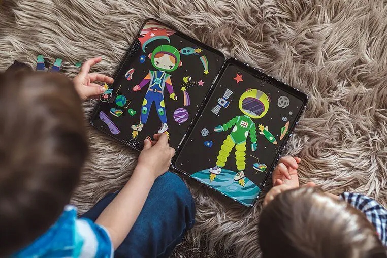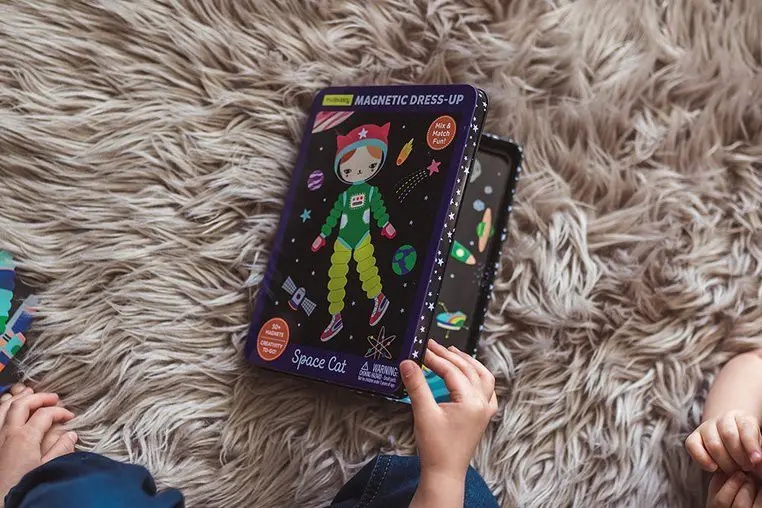 магнитные формы пространство кошка 4+ mudpuppy . Набор магнитов для создания космического персонажа американского бренда MudPuppy является чрезвычайно креативной игрушкой для детей с 4 лет. На двух фонах на внутренней стороне металлической коробки есть место и две оригинальные фигуры кошек - астронавтов. Вы можете положить на них выбранные магниты - костюмы, то есть шлемы, комбинезон, ракетные туфли и другие аксессуары, например, спутники или небесные тела (более 50 элементов), создавая много интересных историй. Игрушка имеет удобный формат, работает дома и путешествует.