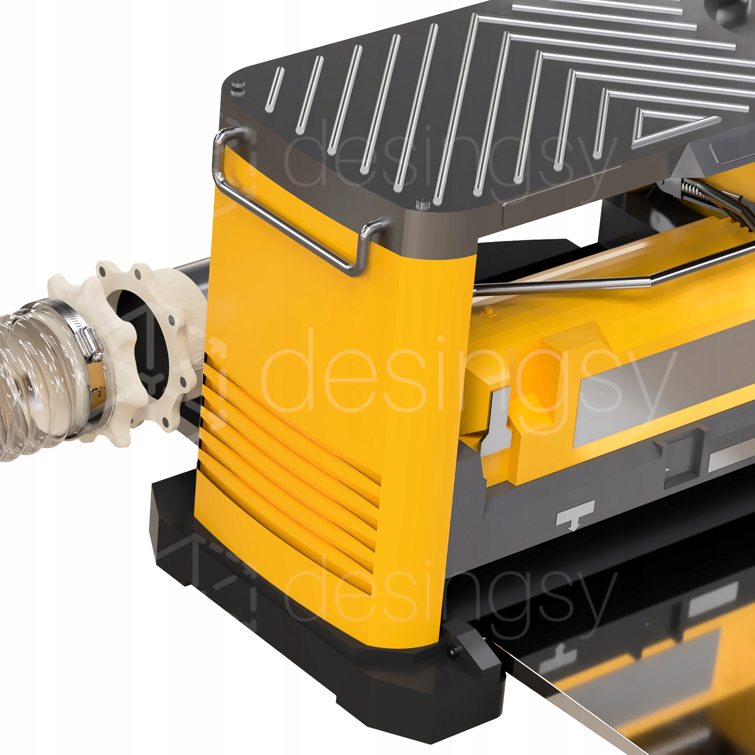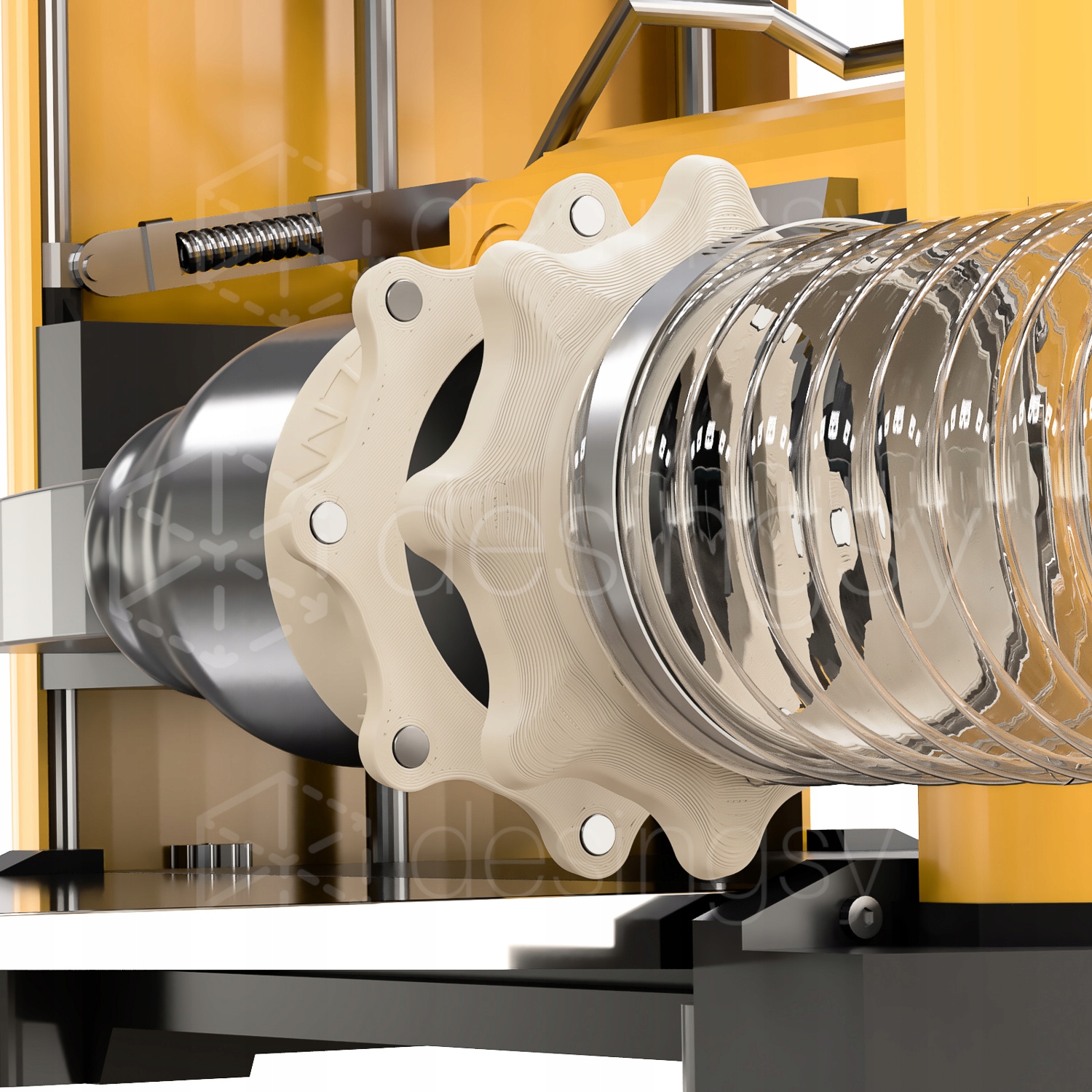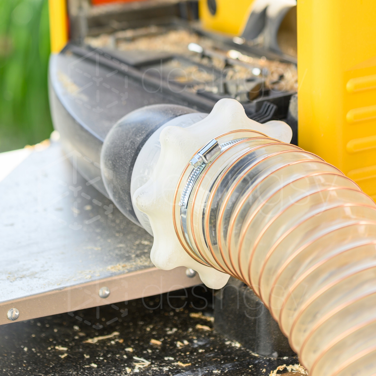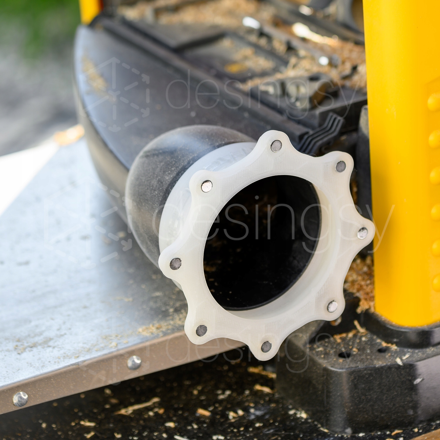 Печатный магнитный соединитель MAGSPIRO™, адаптированный к вытяжному соединению на рейсмусовом станке DeWALT, модель DW733, диаметром около Ø100 мм.
