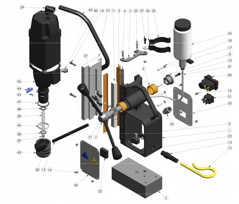 - Магнитная дрель MB 35 с магнитным основанием оснащена мощным двигателем – 1050 Вт – что делает работу эффективной и стабильной. Внимание к деталям, качество отделки и эргономичный дизайн при сравнительно небольшом весе – 11,6 кг – позволяют выполнять точную работу. В случае с трепанирующими сверлами можно сверлить отверстия диаметром до 35 мм. Кроме того, благодаря встроенной системе охлаждения охлаждающая жидкость подается непосредственно из бака к сверлильному шпинделю.