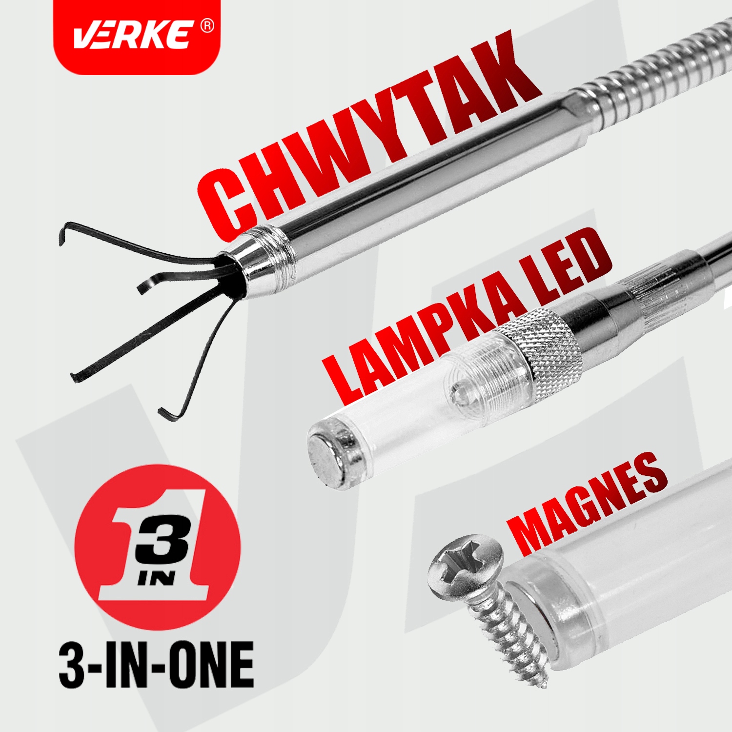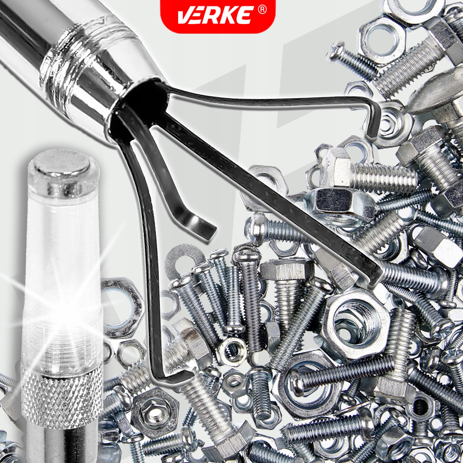 Захват VERKE 3-в-1 — это инструмент, созданный для профессионалов и любителей DIY, которым нужен надежный и удобный способ подъема и захвата деталей в труднодоступных и темных местах. Благодаря сочетанию механического и магнитного захвата и светодиодной подсветки набор позволяет работать с металлическими и неметаллическими материалами, минимизируя риск падения элемента и улучшая видимость в местах с ограниченным доступом.