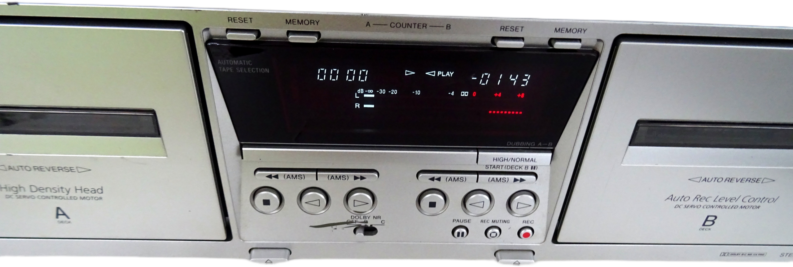 - Технически: Магнитофон работоспособен на 100%. Все функции, такие как воспроизведение, запись, перемотка назад, автореверс в обоих отсеках, системы Dolby и регулировка высоты тона, работают правильно. Механизмы работают тихо и точно. Головки и ролики в отличном состоянии, что обеспечивает чистый и стабильный звук.