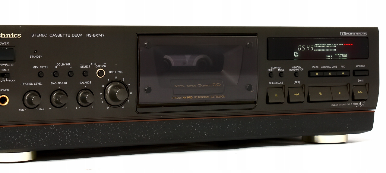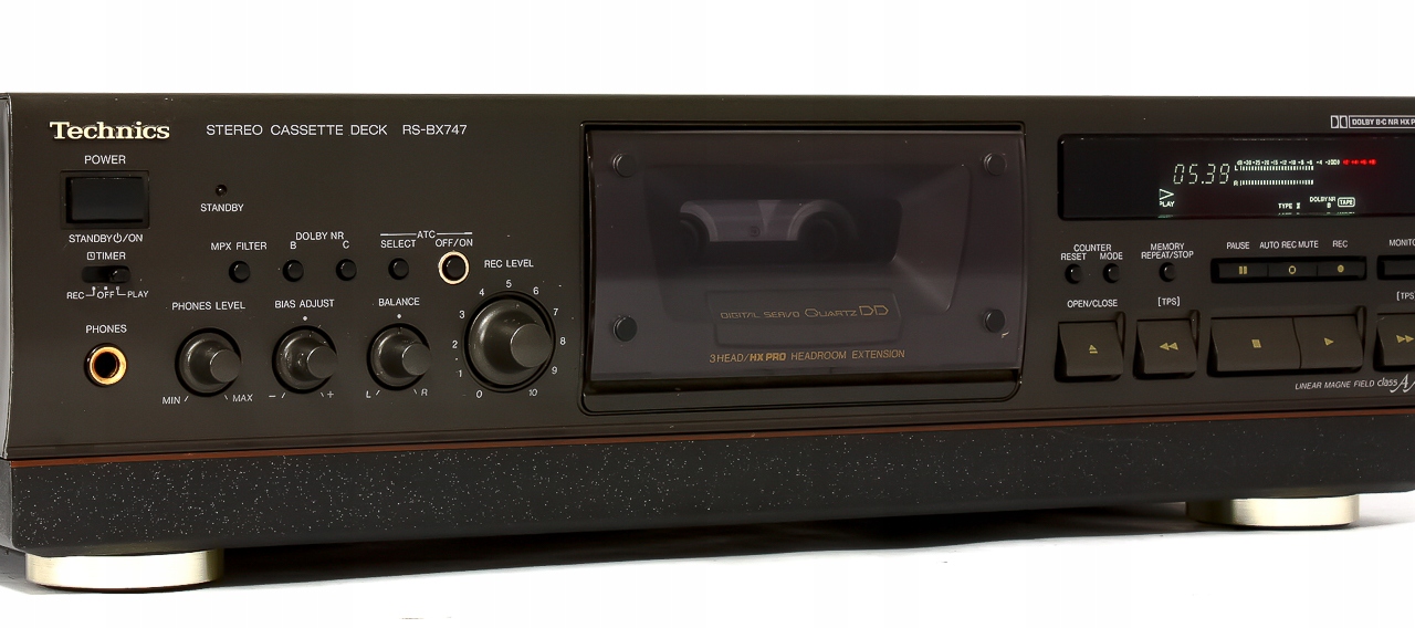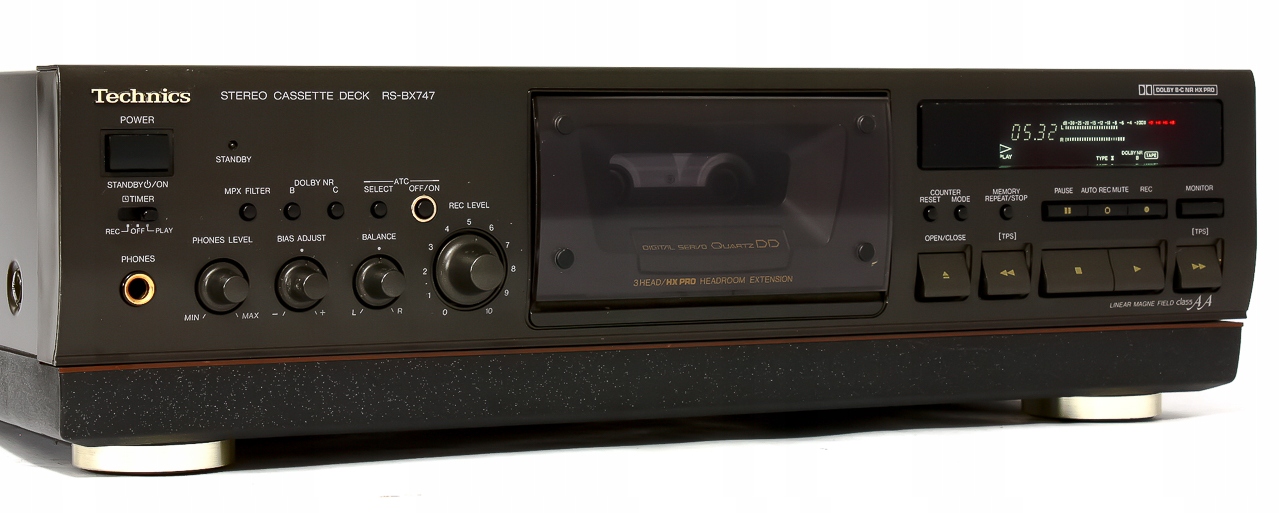 TECHNICS RS-BX747 — магнитофон высокого класса. Когда-то флагман. Очень удачная конструкция, отличающаяся высокой надежностью и хорошим качеством звука. Запись с этого устройства также на высоком уровне и мало чем отличается от звука с компакт-диска. Особенностями, которые, безусловно, выделяют его, являются алюминиевая передняя панель, массивное антивибрационное основание, карман, который автоматически закрывается после вставки кассеты, и множество функций. Тот, у кого есть Техникс, знает, что он нерушим, поэтому рекомендую этот магнитофон всем, кто хочет наслаждаться своими записями на кассетах.
