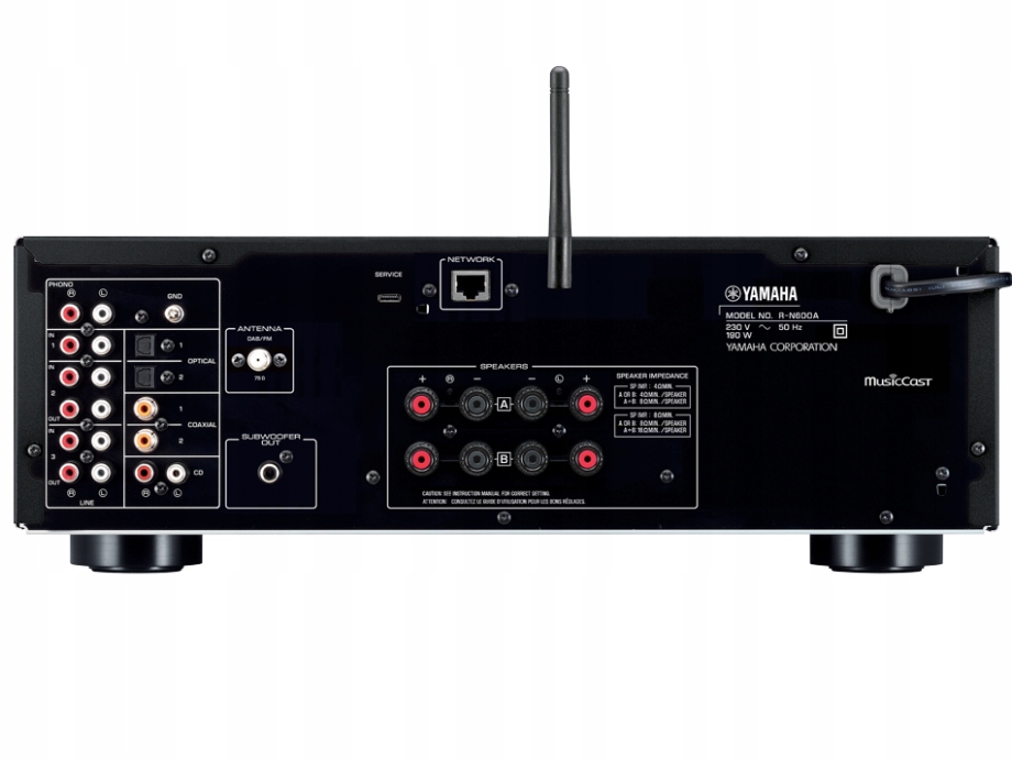 Конструкторы оснастили R-N600A многочисленными разъемами, как аналоговыми, так и цифровыми, которые обеспечивают взаимодействие с различными источниками сигнала. Вы можете использовать два аналоговых входа RCA, включая один, специально предназначенный для подключения проигрывателя виниловых пластинок. Эта модель также предлагает два оптических цифровых входа и два коаксиальных цифровых входа. На задней панели ресивера вы также найдете выход для активного сабвуфера. На передней панели имеется выход для наушников и порт USB-A, позволяющий воспроизводить звук с портативных носителей информации.