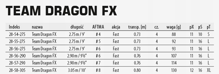 Серия четырехсоставных удилищ TEAM DRAGON FX удилища, позволяющие динамично отправлять леску на большие поверхности и расстояния, а их грамотно подобранный прогиб, несмотря на быстрый строй, будет гарантировать идеальную подачу приманки. Они очень чувствительные, легкие и в то же время прочные и долговечные. Каждый рыболов, взяв их в руки, сразу почувствует, что это снаряжение, которое изменит его достижения на воде, предоставив более широкие возможности в плане достижения позиции рыбы, направления мушки и управления оснасткой. Это относится как к легкой удочке № 4 для сухой нахлыста, так и к десятифутовой удочке «8», которая позволит вам охотиться на щуку или морскую форель. А когда вы поймаете рыбу своей мечты, FX позволит вам почувствовать, что такое быстрый крючок и надежная катушка.