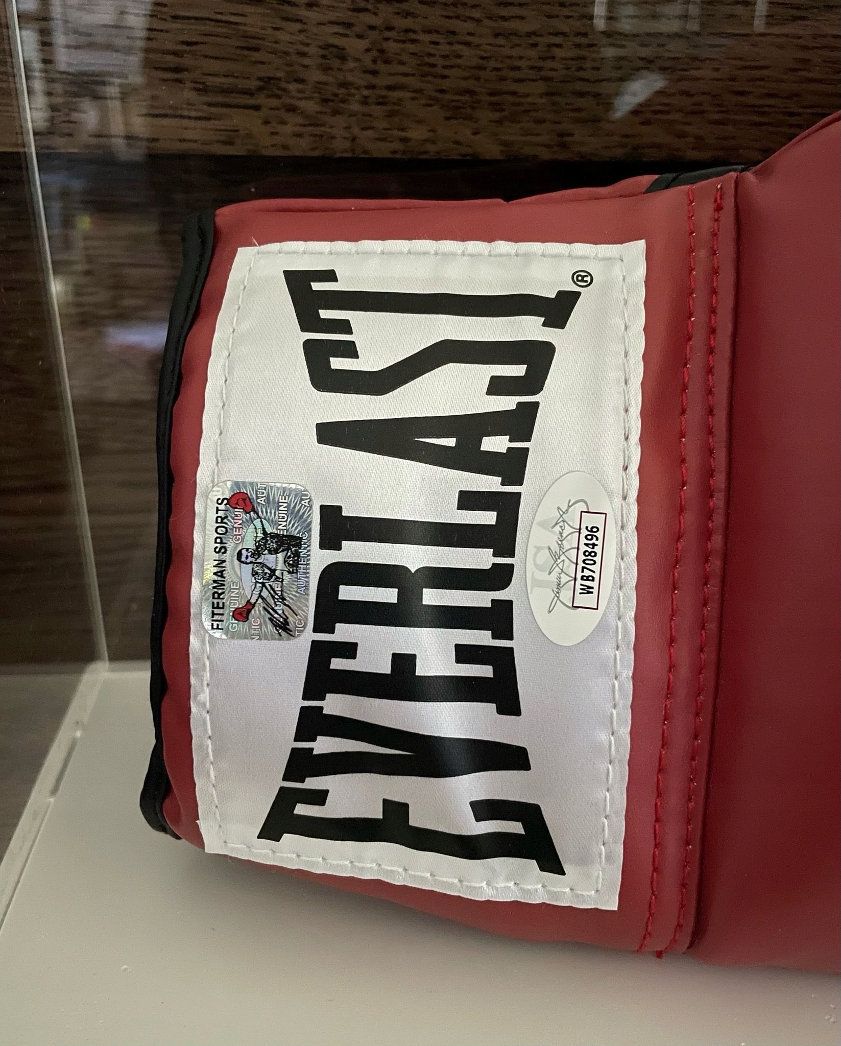 значок бокса. Бесценный сувенир. Ваше наследие. Эксклюзивная спортивная наклейка Fterman. Перчатка представлена в профессиональном, роскошном шкафу, подчеркивая его уникальный характер и ценность коллекционера.